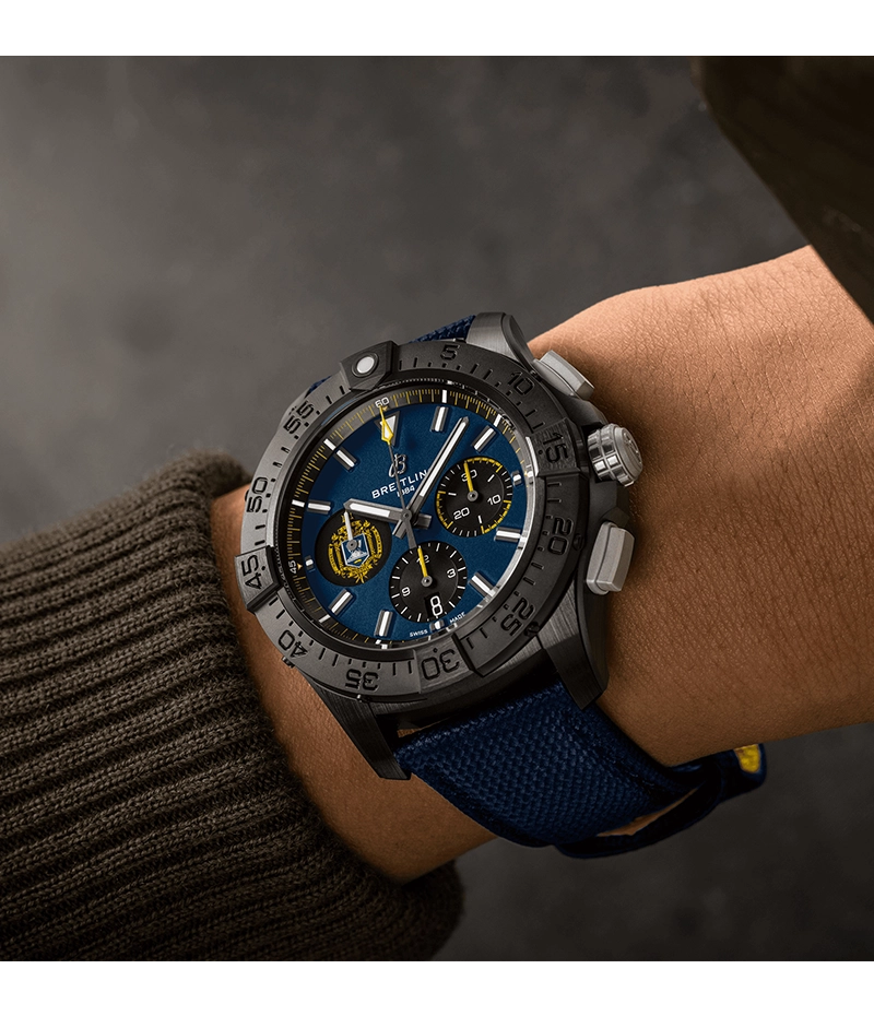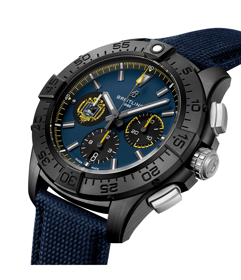 各エディションには、それぞれの飛行部隊のエンブレムと配色(ダストデビルズの赤と黒、ブラッドハウンズの灰色と黄色、そして米海軍士官学校の青と黄色)をモチーフにしています。さらにブライトリング マニュファクチュール キャリバー「01」のオープンケースバックには、特別な刻印が施されています。