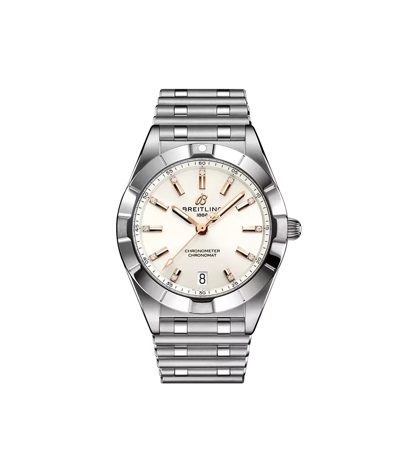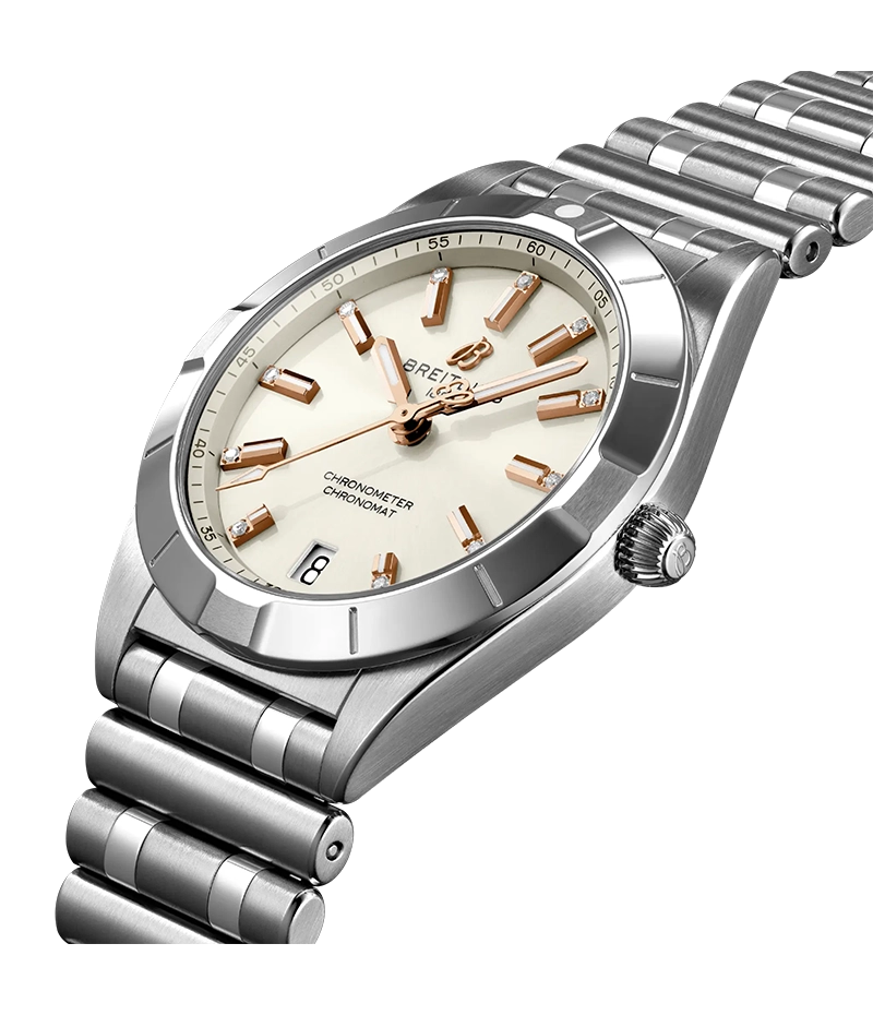 ブライトリングのアイコニックな着け心地のいいバタフライクラスプ付きの「ルーロー(フランス語で筒状)」ブレスレットを備えたクロノマット 32は、COSC認定SuperQuartz™クロノメーターのブライトリング「キャリバー77」を搭載しています。