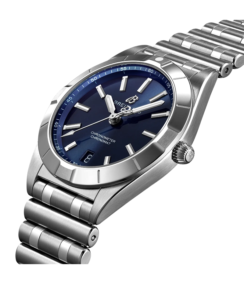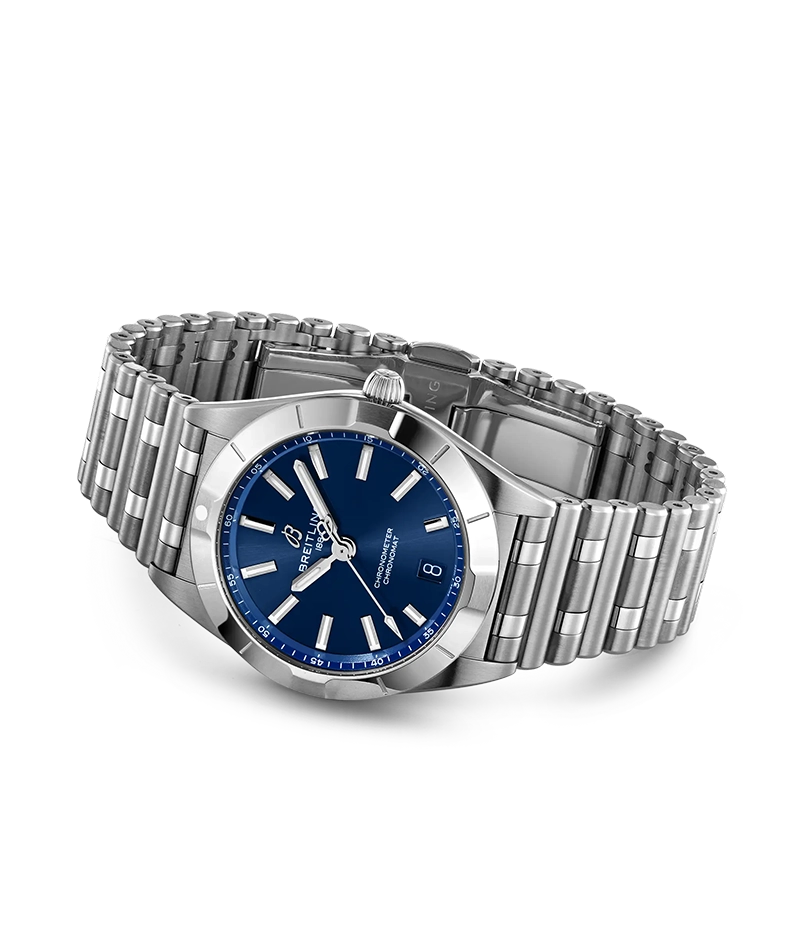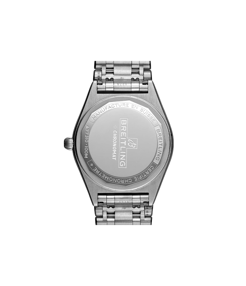 ブライトリングのアイコニックな着け心地のいいバタフライクラスプ付きの「ルーロー(フランス語で筒状)」ブレスレットを備えたクロノマット 32は、COSC認定SuperQuartz™クロノメーターのブライトリング「キャリバー77」を搭載しています。