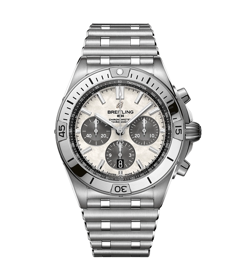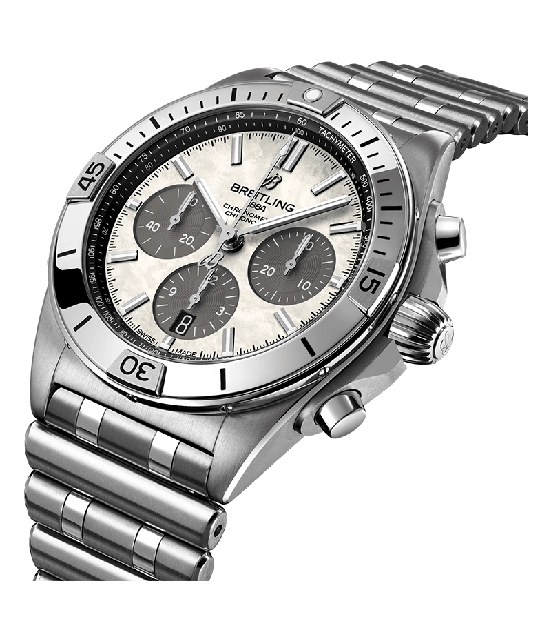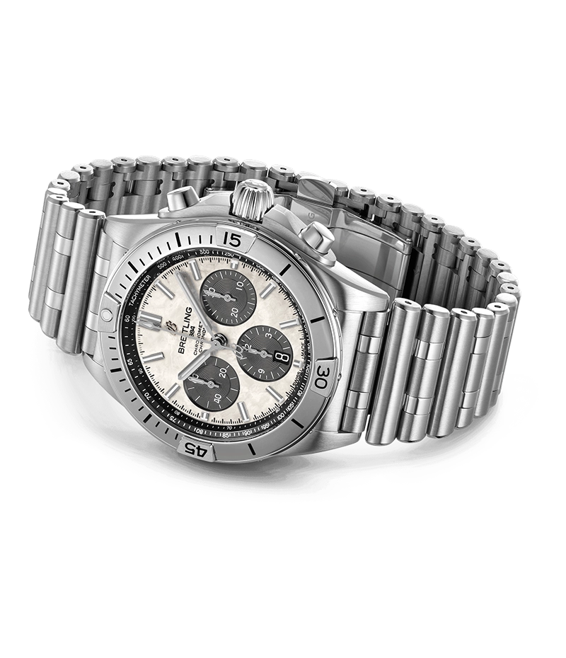 かの有名なイタリア空軍とのコラボレーションにより、1983年に登場した「フレッチェ・トリコローリ・クロノグラフ」をもとに開発されたクロノマットの登場は、ブライトリングの創業100周年という大きな節目を祝福するものでした。同時に、ブランドの象徴的存在として機械式クロノグラフが復活を遂げたのです。以降、過酷なフライトに耐える実用性と、フライトジャケットを脱いだ後のオフタイムにも合うスタイリッシュさにより、世界的な評価を獲得するに至りました。