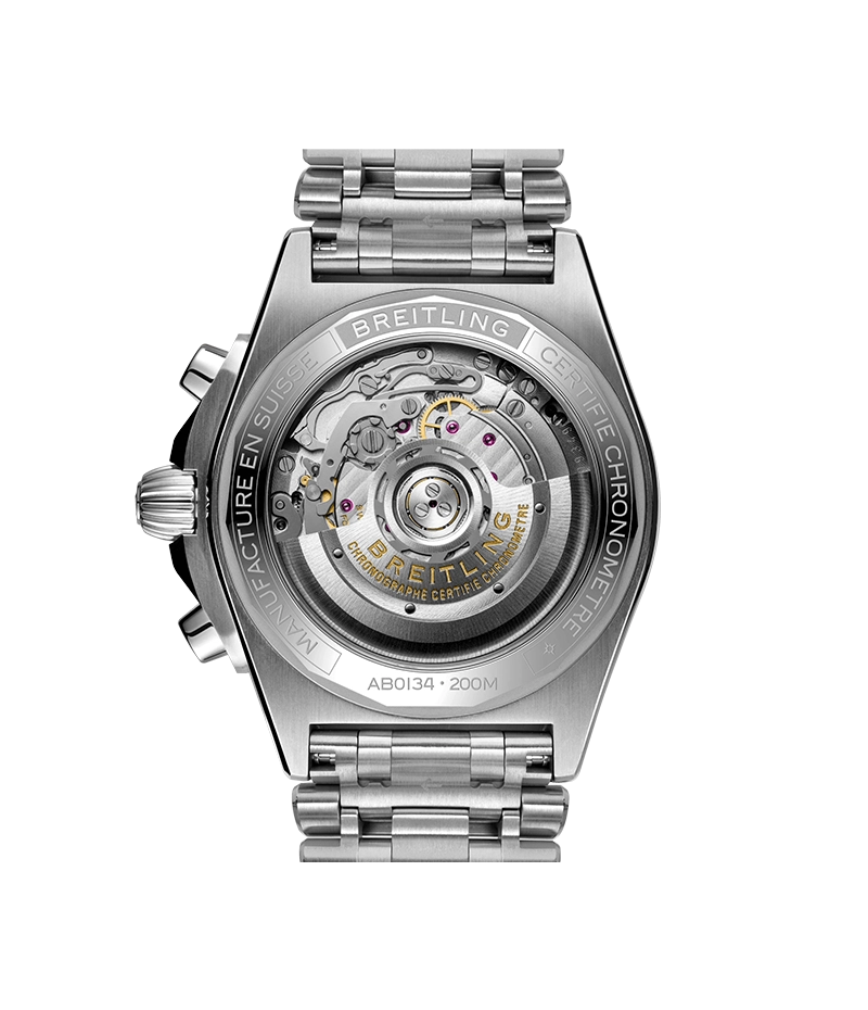 クロノマットに搭載されるムーブメントはCOSC公認クロノメーターのブライトリング自社開発製造「キャリバー01」です。サファイアクリスタル・ケースバック越しに、その精緻な動きを眺めていただくことができます。