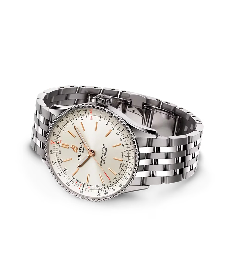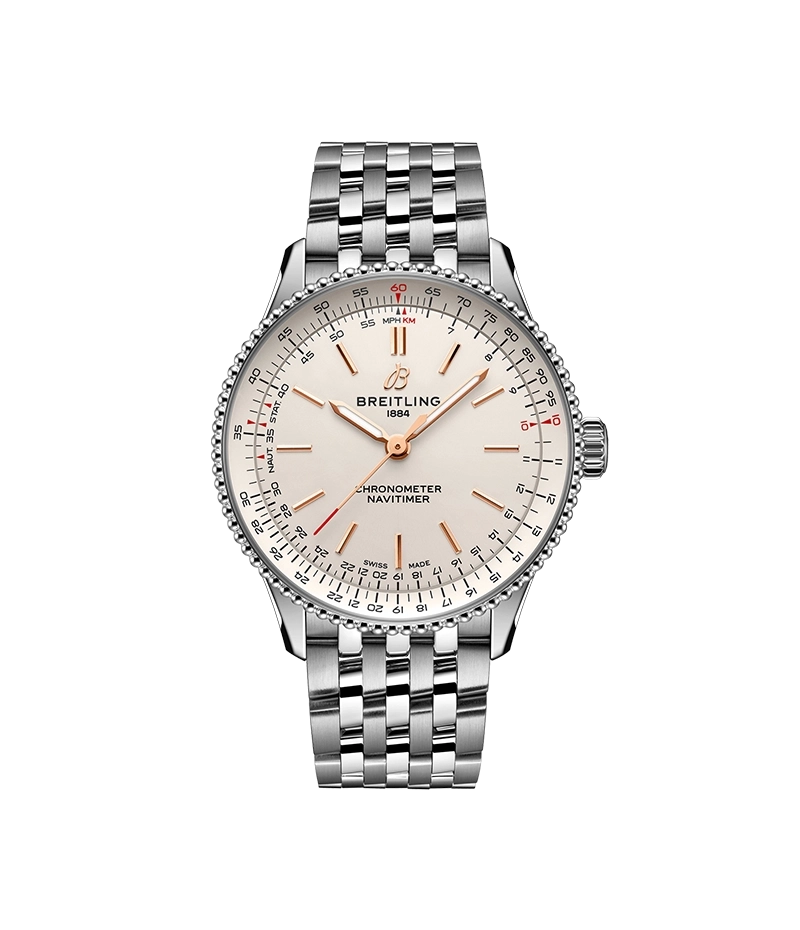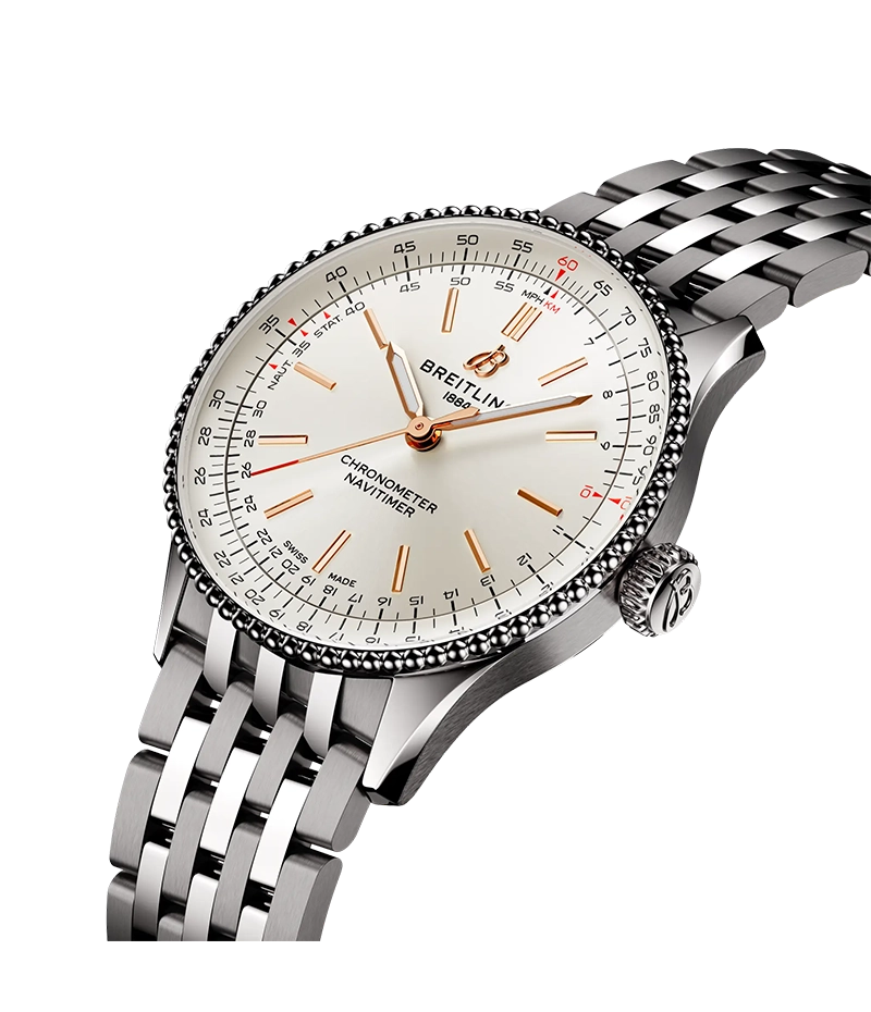 このアイコンに、小さめの腕時計の外観と感覚を好む男女に向けて、36 mmと32 mmのサイズをラインナップ。36 mmモデルは、ビーズ装飾のベゼルとアイコニックな回転計算尺により一目でそれと分かるナビタイマーを採用しています。