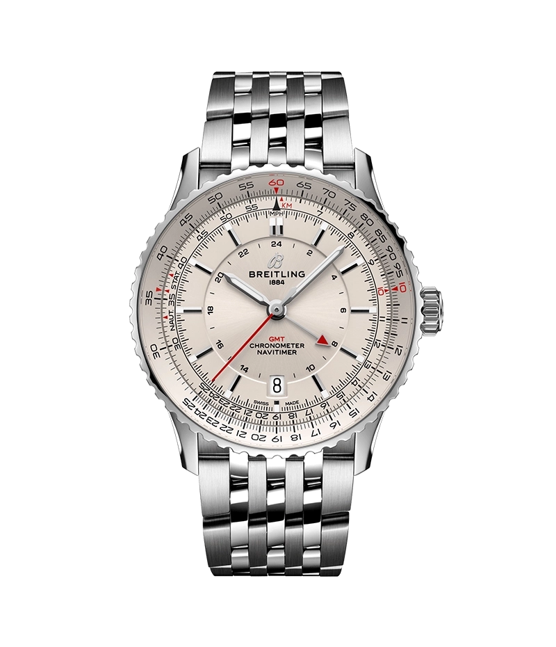 「ナビタイマー オートマチック GMT 41 」は、アイコニックな外観を取り入れながらクロノグラフを省き、バランスの取れたダイヤル構成になっています。GMTは24時間目盛りを中央に配置し、オートマチックではすっきりとしたフェイスを採用することで、複雑な計算尺を際立たせながら、全体的な美しさを引き締めています。