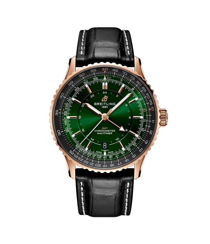「ナビタイマー オートマチック GMT 41 」は、アイコニックな外観を取り入れながらクロノグラフを省き、バランスの取れたダイヤル構成になっています。GMTは24時間目盛りを中央に配置し、オートマチックではすっきりとしたフェイスを採用することで、複雑な計算尺を際立たせながら、全体的な美しさを引き締めています。