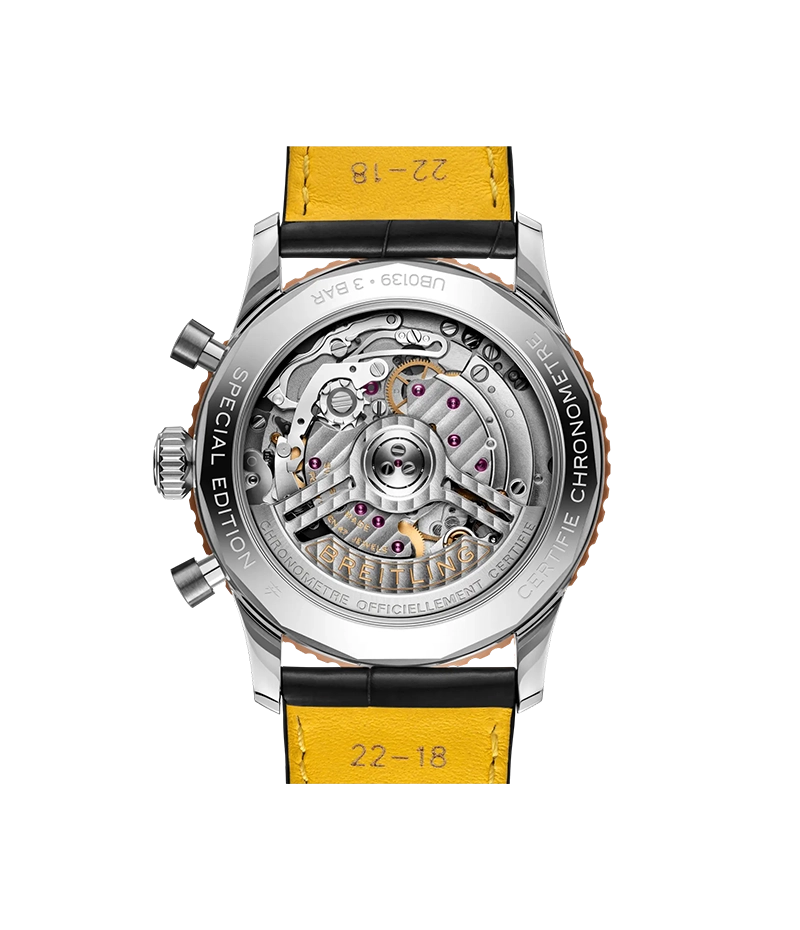 搭載されるのはもちろんマニュファクチュール・クロノグラフ、ブライトリング「キャリバー 01」。サファイアクリスタル・ケースバック越しに、その精緻な動きを眺めていただくことが可能です。