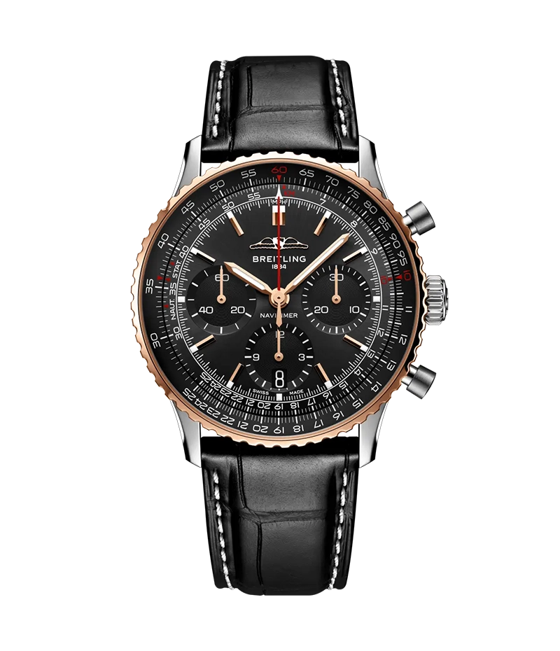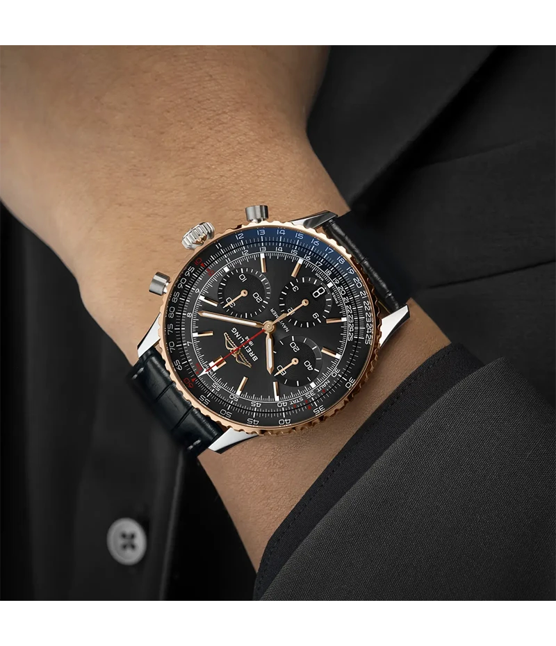 現在のナビタイマーはその最もクラシックな特徴を保ちながらも、現代に即した改良を加えています。平らにした回転計算尺とドーム型サファイアクリスタルで、よりスリムな外観を実現。金属部分にはポリッシュとサテン仕上げを交互に施すことで、光沢を出しつつも控えめな印象に。そして、AOPAの翼が本来の12時位置に戻ったこともその長い歴史の出発点を思い起こさせるアップデートと言えるでしょう。
