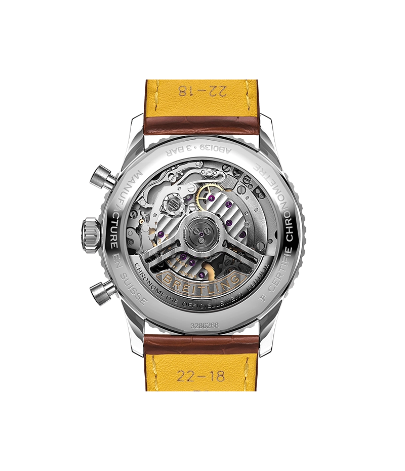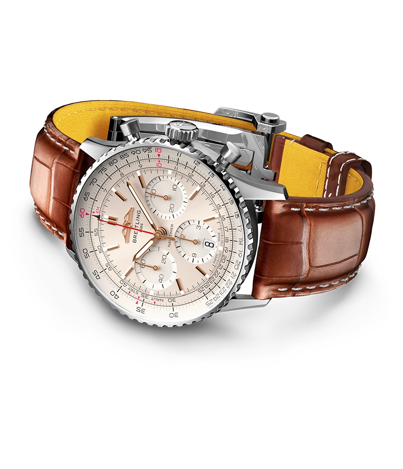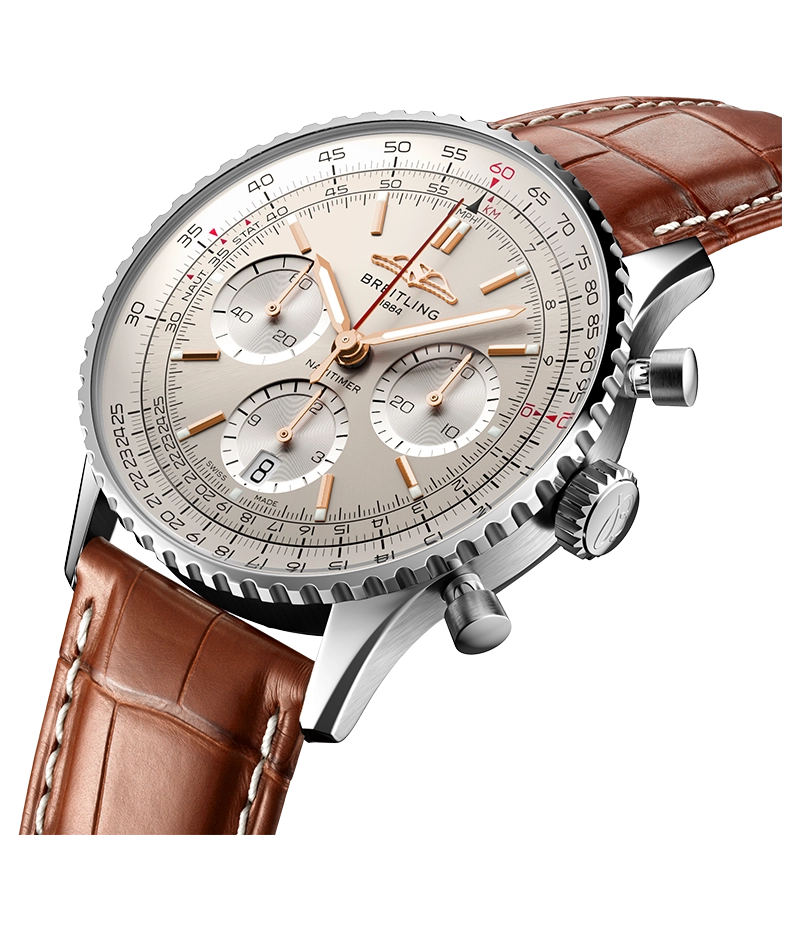 1952年の発売以来、ブライトリングのアイコンには数多くのモデルが製造されてきましたが、現在のナビタイマーはその最もクラシックな特徴を保ちながらも、現代に即した改良を加えています。平らにした回転計算尺とドーム型クリスタルで、よりスリムな外観を実現。ポリッシュとサテン仕上げを交互に施した金属部品を採用したことで、光沢を出しつつも控えめな印象に。そして、「AOPAの翼」が本来の12時位置に戻ったことも、ノスタルジーを喚起するアップデートと言えるでしょう。
