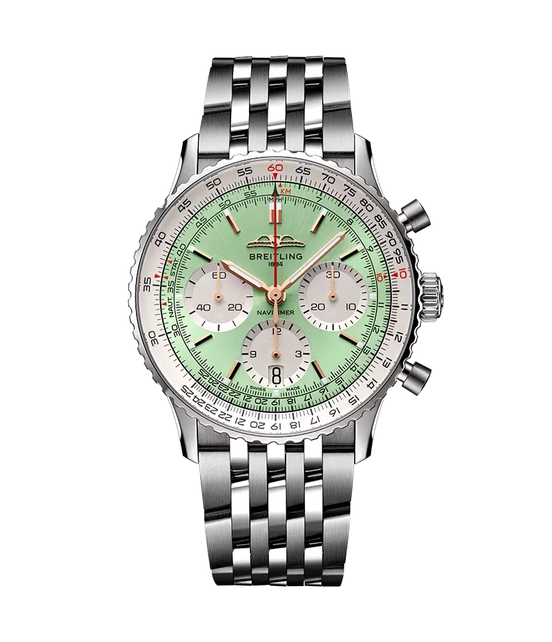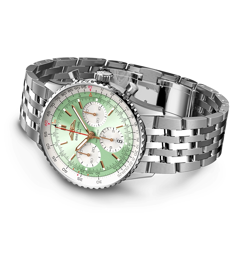 1952年の発売以来、ブライトリングのアイコンには数多くのモデルが製造されてきましたが、現在のナビタイマーはその最もクラシックな特徴を保ちながらも、現代に即した改良を加えています。平らにした回転計算尺とドーム型クリスタルで、よりスリムな外観を実現。ポリッシュとサテン仕上げを交互に施した金属部品を採用したことで、光沢を出しつつも控えめな印象に。そして、「AOPAの翼」が本来の12時位置に戻ったことも、ノスタルジーを喚起するアップデートと言えるでしょう。