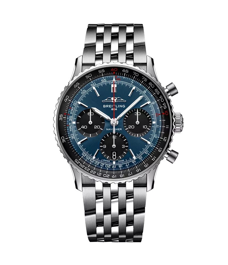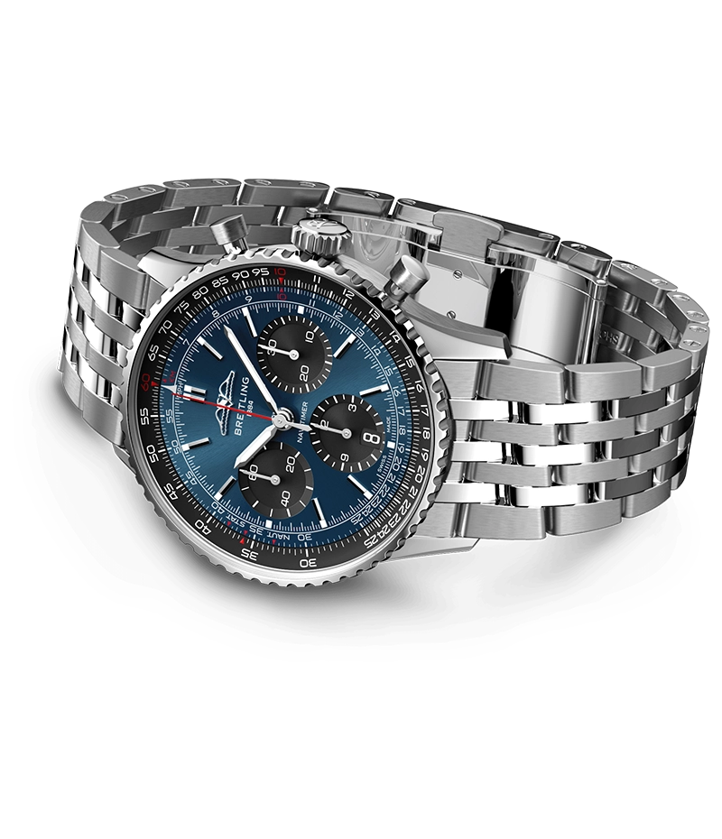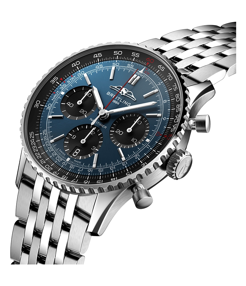1952年の発売以来、ブライトリングのアイコンには数多くのモデルが製造されてきましたが、現在のナビタイマーはその最もクラシックな特徴を保ちながらも、現代に即した改良を加えています。平らにした回転計算尺とドーム型クリスタルで、よりスリムな外観を実現。ポリッシュとサテン仕上げを交互に施した金属部品を採用したことで、光沢を出しつつも控えめな印象に。そして、「AOPAの翼」が本来の12時位置に戻ったことも、ノスタルジーを喚起するアップデートと言えるでしょう。
