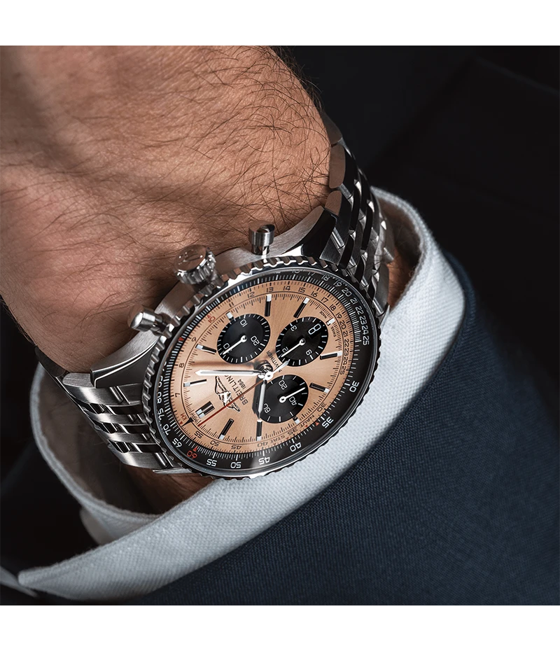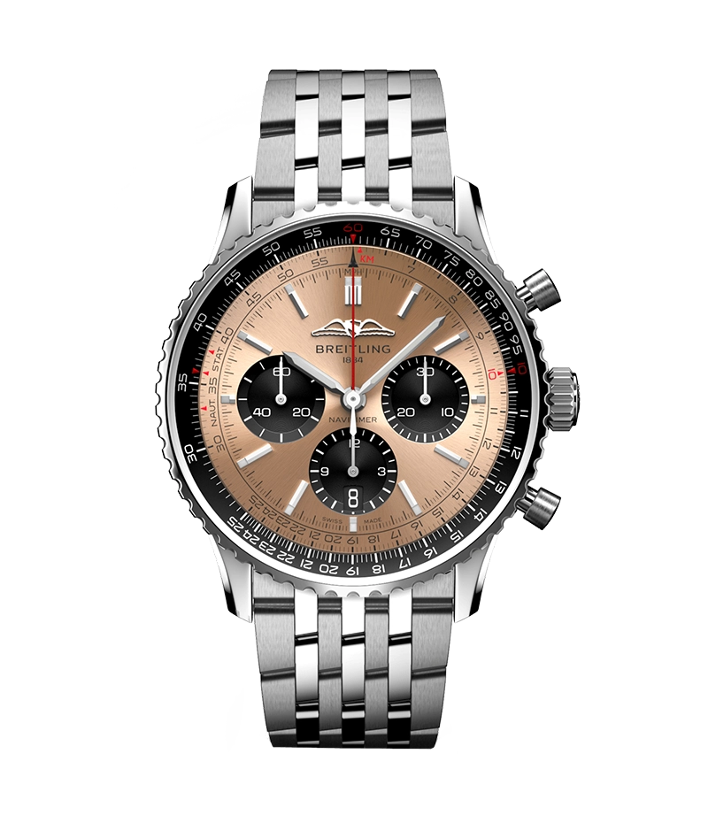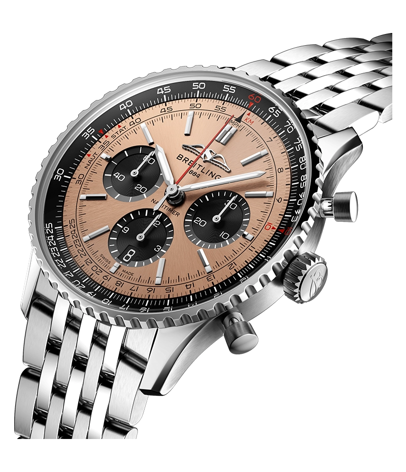 1952年の発売以来、ブライトリングのアイコンには数多くのモデルが製造されてきましたが、現在のナビタイマーはその最もクラシックな特徴を保ちながらも、現代に即した改良を加えています。平らにした回転計算尺とドーム型クリスタルで、よりスリムな外観を実現。ポリッシュとサテン仕上げを交互に施した金属部品を採用したことで、光沢を出しつつも控えめな印象に。そして、「AOPAの翼」が本来の12時位置に戻ったことも、ノスタルジーを喚起するアップデートと言えるでしょう。