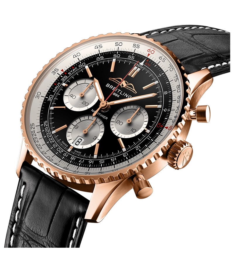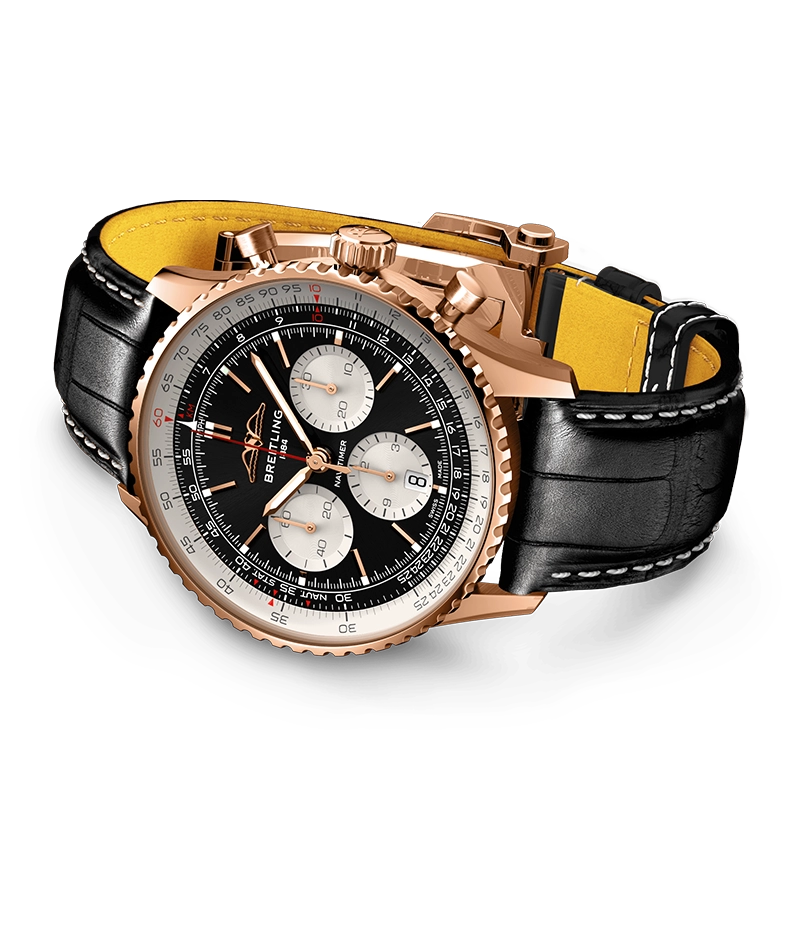 1952年の発売以来、ブライトリングのアイコンには数多くのモデルが製造されてきましたが、現在のナビタイマーはその最もクラシックな特徴を保ちながらも、現代に即した改良を加えています。平らにした回転計算尺とドーム型クリスタルで、よりスリムな外観を実現。ポリッシュとサテン仕上げを交互に施した金属部品を採用したことで、光沢を出しつつも控えめな印象に。そして、「AOPAの翼」が本来の12時位置に戻ったことも、ノスタルジーを喚起するアップデートと言えるでしょう。