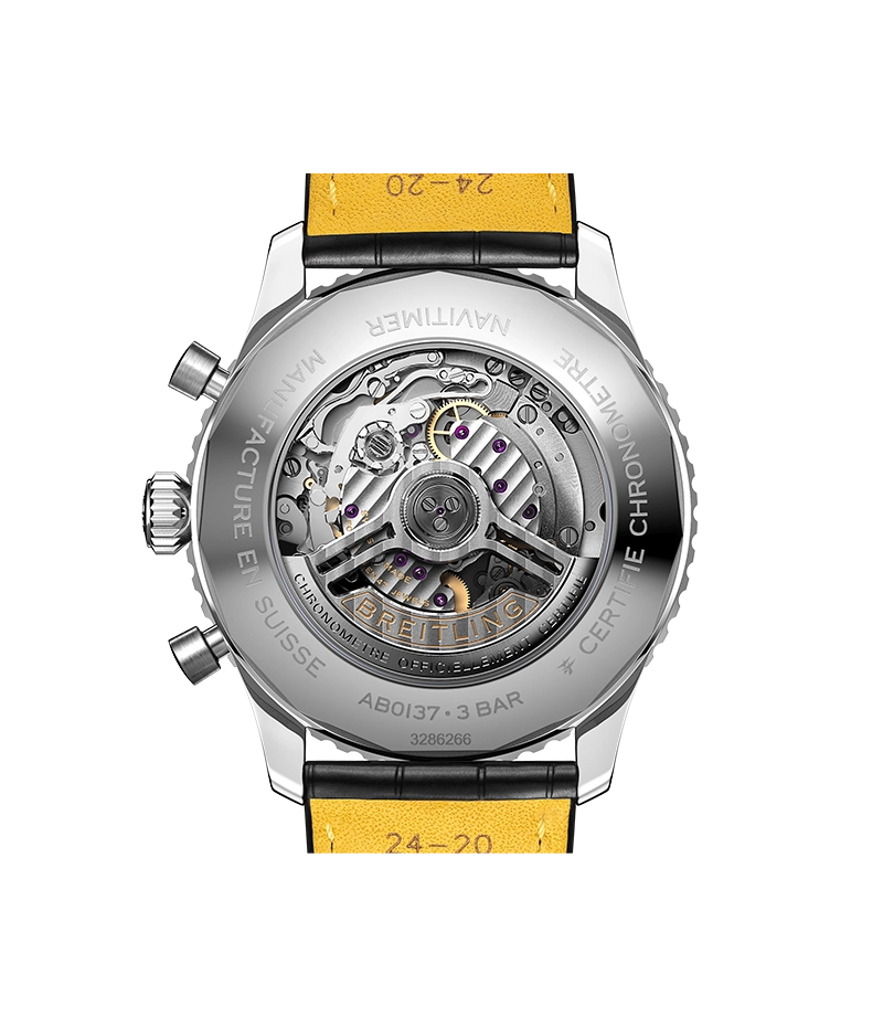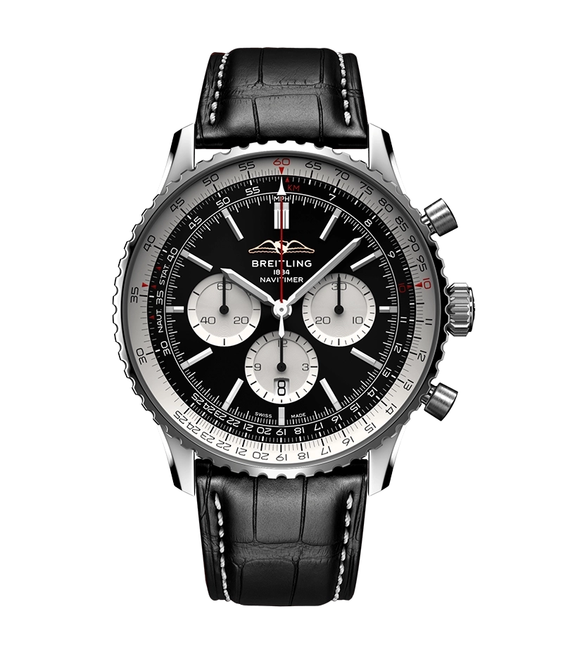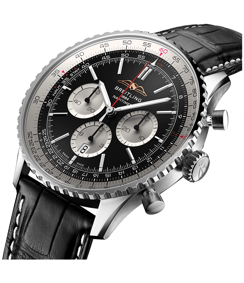 1952年の発売以来、ブライトリングのアイコンには数多くのモデルが製造されてきましたが、現在のナビタイマーはその最もクラシックな特徴を保ちながらも、現代に即した改良を加えています。平らにした回転計算尺とドーム型クリスタルで、よりスリムな外観を実現。ポリッシュとサテン仕上げを交互に施した金属部品を採用したことで、光沢を出しつつも控えめな印象に。そして、「AOPAの翼」が本来の12時位置に戻ったことも、ノスタルジーを喚起するアップデートと言えるでしょう。