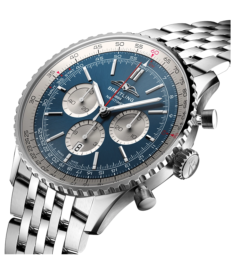 1952年の発売以来、ブライトリングのアイコンには数多くのモデルが製造されてきましたが、現在のナビタイマーはその最もクラシックな特徴を保ちながらも、現代に即した改良を加えています。平らにした回転計算尺とドーム型クリスタルで、よりスリムな外観を実現。ポリッシュとサテン仕上げを交互に施した金属部品を採用したことで、光沢を出しつつも控えめな印象に。そして、「AOPAの翼」が本来の12時位置に戻ったことも、ノスタルジーを喚起するアップデートと言えるでしょう。