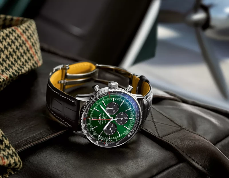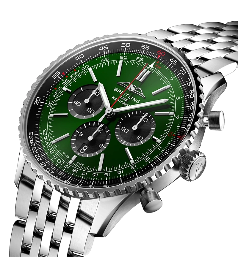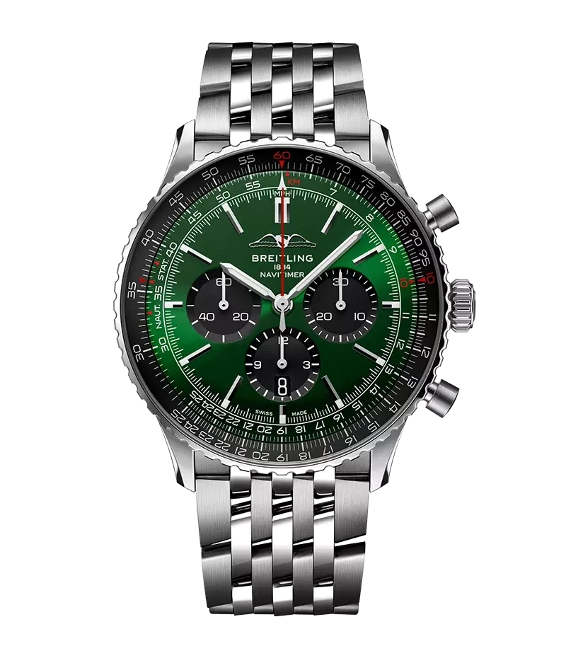 1952年の発売以来、ブライトリングのアイコンには数多くのモデルが製造されてきましたが、現在のナビタイマーはその最もクラシックな特徴を保ちながらも、現代に即した改良を加えています。平らにした回転計算尺とドーム型クリスタルで、よりスリムな外観を実現。ポリッシュとサテン仕上げを交互に施した金属部品を採用したことで、光沢を出しつつも控えめな印象に。そして、「AOPAの翼」が本来の12時位置に戻ったことも、ノスタルジーを喚起するアップデートと言えるでしょう。