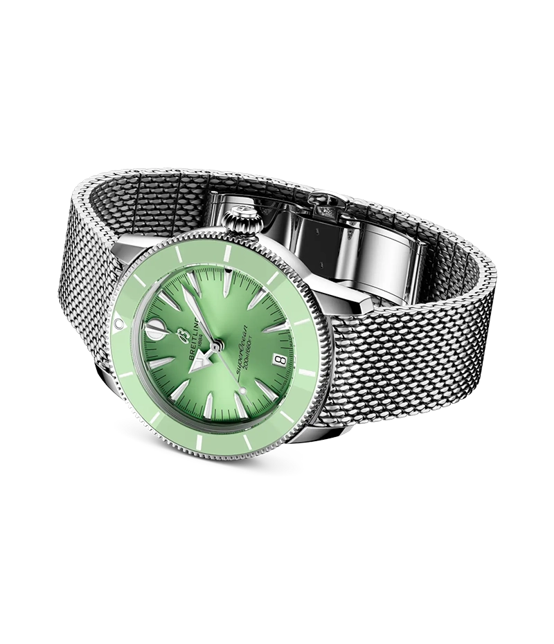最新の「スーパーオーシャン ヘリテージ オートマチック 36」は、オリジナルが持っていた個性をさらに際立たせ、洗練を重ねています。ダイヤルと同系色のセラミックを象嵌したベゼルにより、優れた耐傷性能が実現され、新品のような美しさを長く保つことができます。また、より薄型でケースに一体化したメッシュのメタルブレスレットおよびメッシュ風ラバーストラップは、防水性の高いフィット感を実現。フォールディングクラスプを備え、シームレスな仕上がりとなっています。