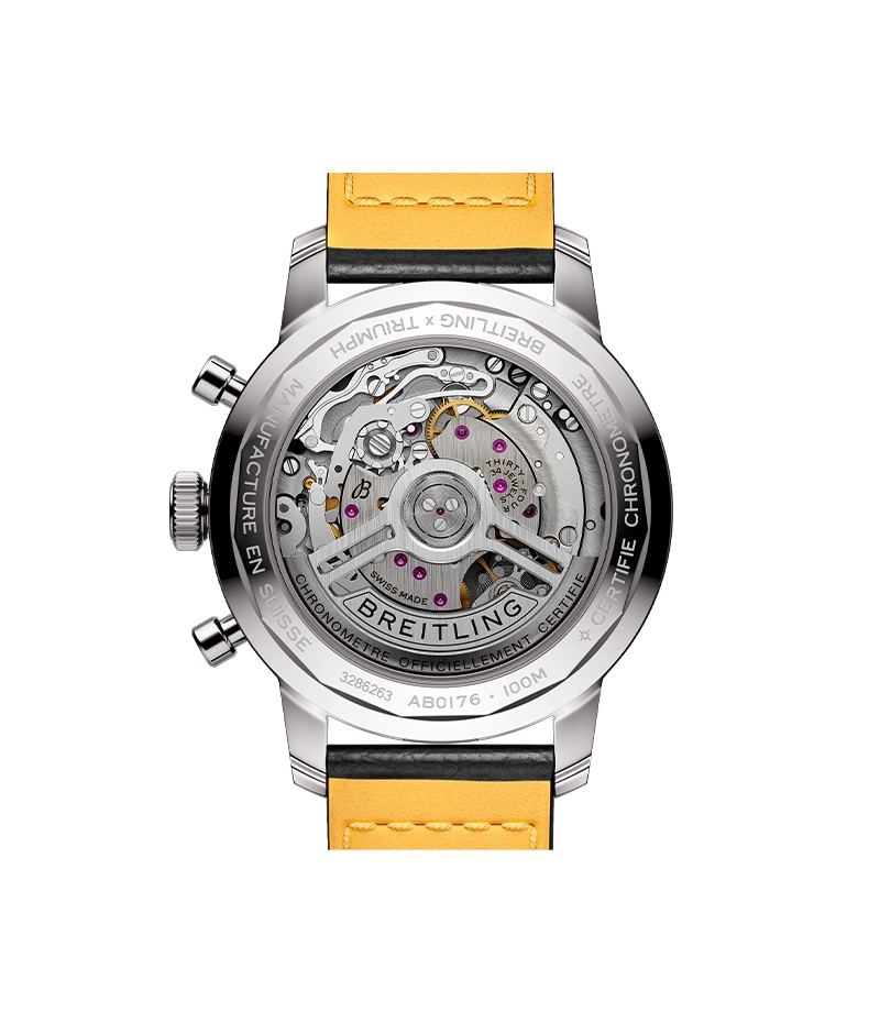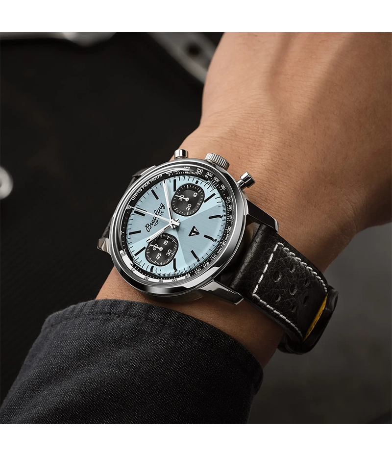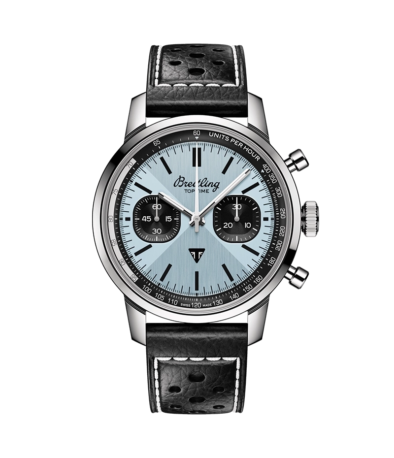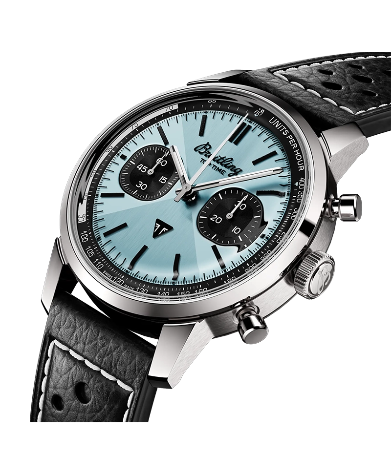 イギリスの歴史あるモーターサイクルブランド、トライアンフとのコラボレーションによるこのウォッチのハイライトは、アイスブルーのダイヤル。この特徴的なカラーは、1951年発売のトライアンフ・サンダーバード6Tと、1970年代の希少なブライトリング トップタイム Ref. 815ブルーダイヤルモデルと同色。 レトロなロゴ、マッシュルームプッシャー、「ゾロ」ダイヤルなど、ヴィンテージのブライトリングを彷彿とさせるコレクターズモデルです。