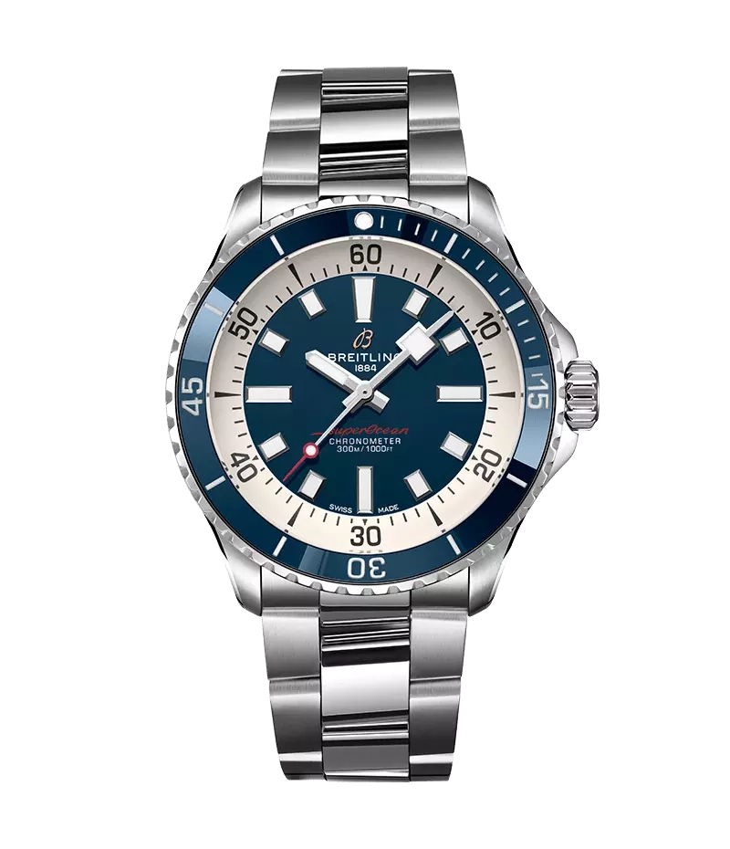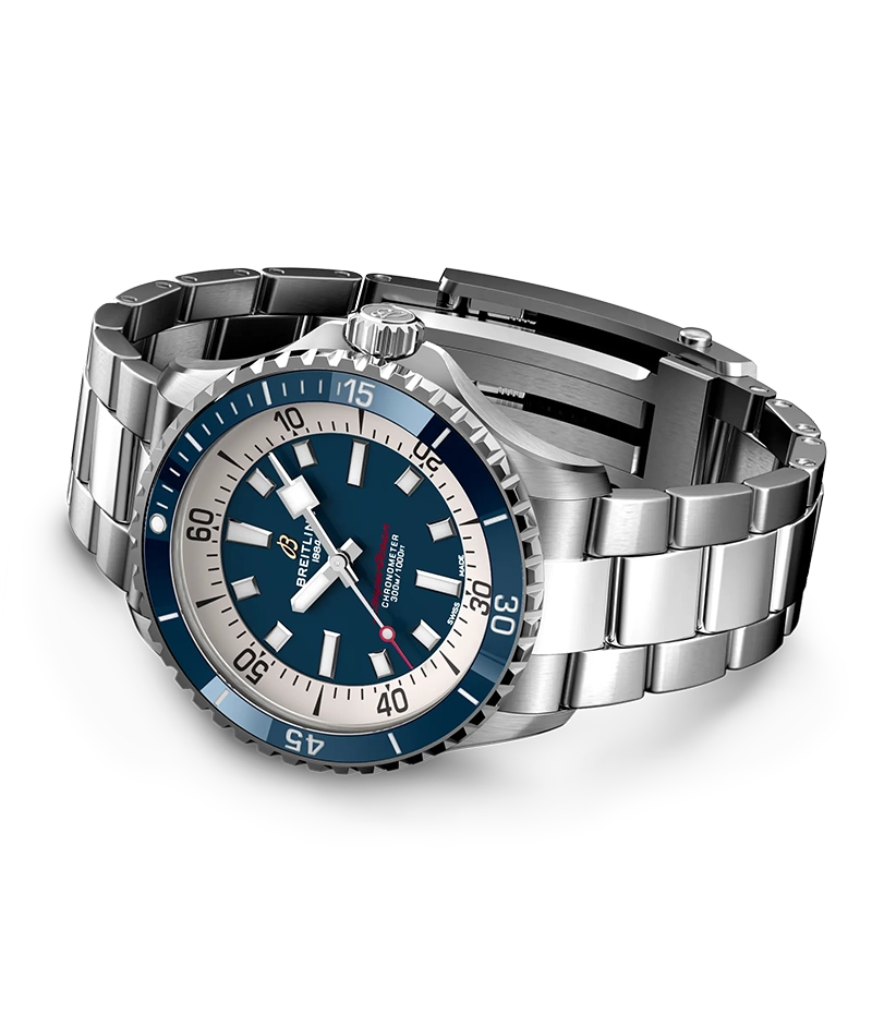 「スーパーオーシャン オートマチック 42」は、人気の高かったスローモーションのデザインコードを踏襲しながらも、セラミックインレイベゼルや鮮やかな色のダイヤルなど現代的な特徴を加味しています。また、幅広の針とインデックスには蓄光塗料スーパールミノバ®が塗布され、水中でも読み取りやすくなっています。