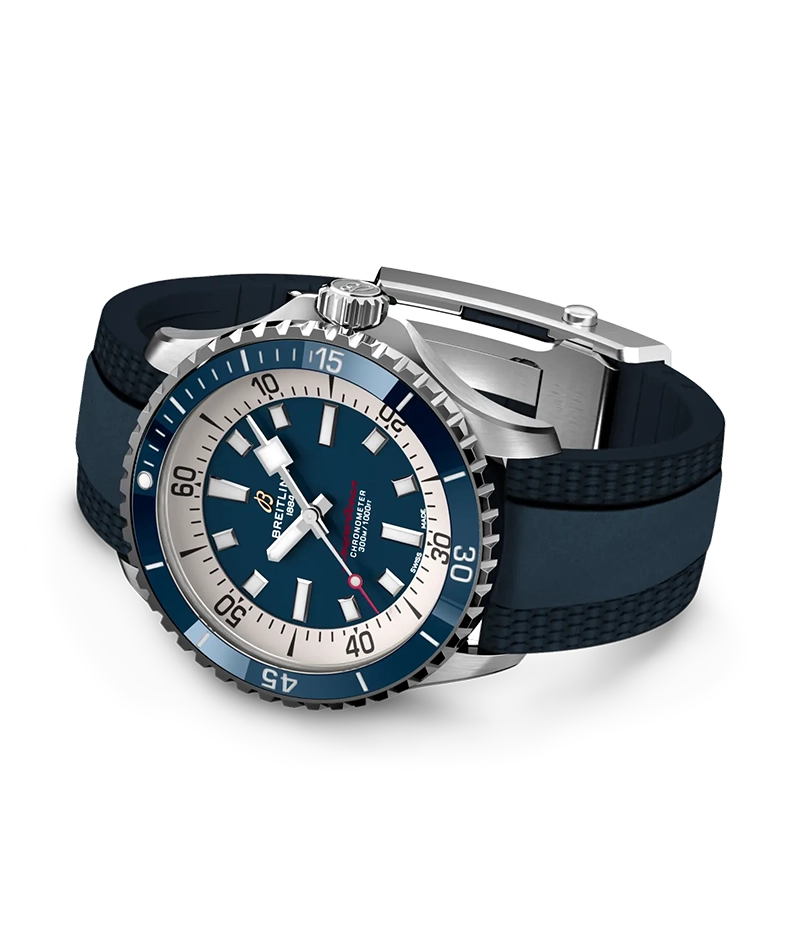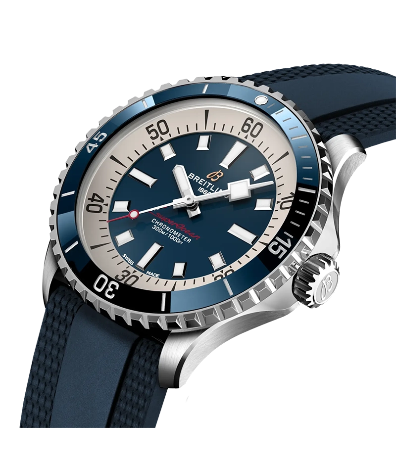 「スーパーオーシャン オートマチック 42」は、人気の高かったスローモーションのデザインコードを踏襲しながらも、セラミックインレイベゼルや鮮やかな色のダイヤルなど現代的な特徴を加味しています。また、幅広の針とインデックスには蓄光塗料スーパールミノバ®が塗布され、水中でも読み取りやすくなっています。