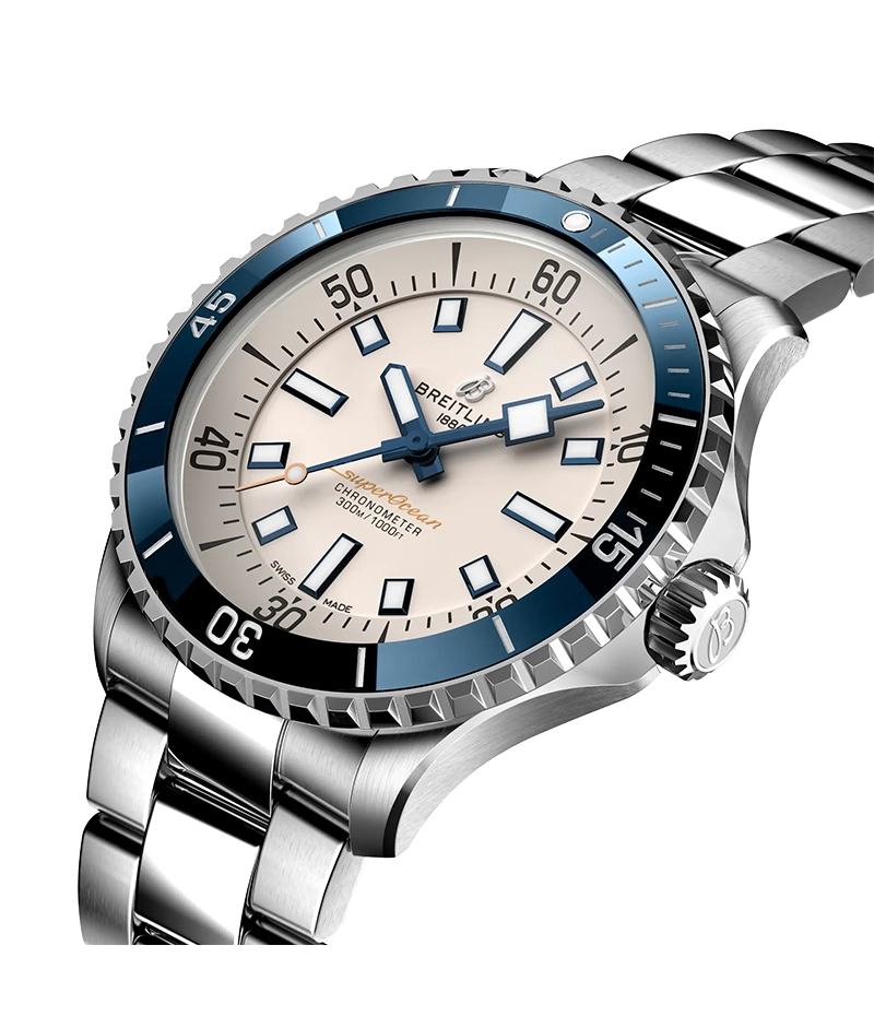 「スーパーオーシャン オートマチック 42」は、人気の高かったスローモーションのデザインコードを踏襲しながらも、セラミックインレイベゼルや鮮やかな色のダイヤルなど現代的な特徴を加味しています。また、幅広の針とインデックスには蓄光塗料スーパールミノバ®が塗布され、水中でも読み取りやすくなっています。