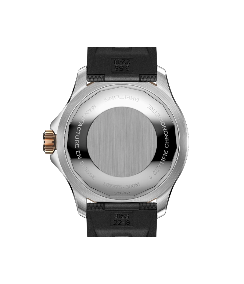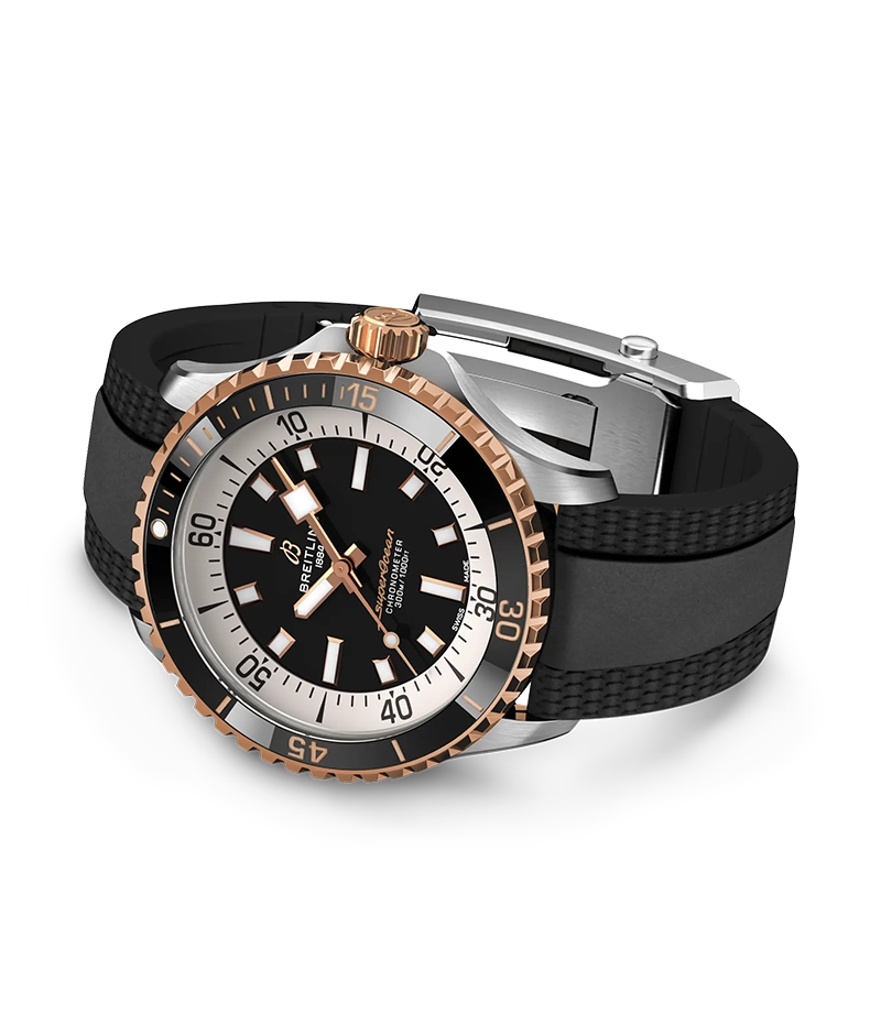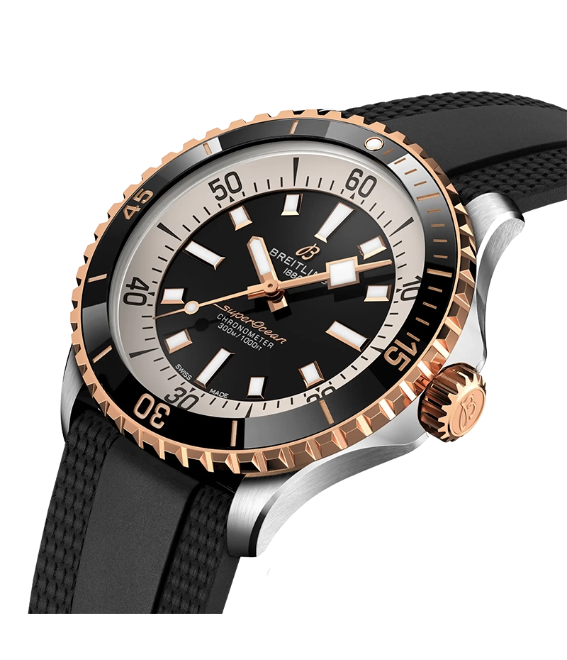 「スーパーオーシャン オートマチック 42」は、人気の高かったスローモーションのデザインコードを踏襲しながらも、セラミックインレイベゼルや鮮やかな色のダイヤルなど現代的な特徴を加味しています。また、幅広の針とインデックスには蓄光塗料スーパールミノバ®が塗布され、水中でも読み取りやすくなっています。