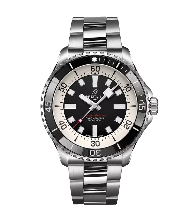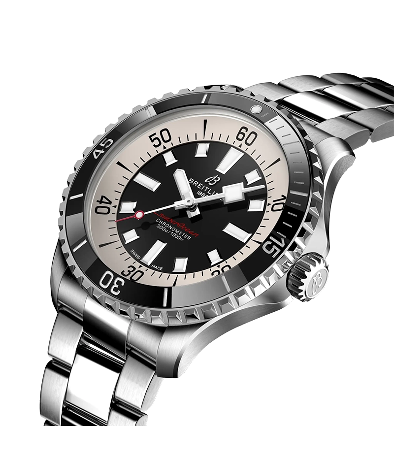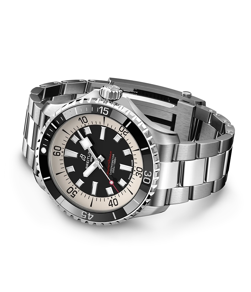 「スーパーオーシャン オートマチック 44」は、人気の高かったスローモーションのデザインコードを踏襲しながらも、セラミックインレイベゼルや鮮やかな色のダイヤルなど現代的な特徴を加味しています。また、幅広の針とインデックスには蓄光塗料スーパールミノバ®が塗布され、水中でも読み取りやすくなっています。