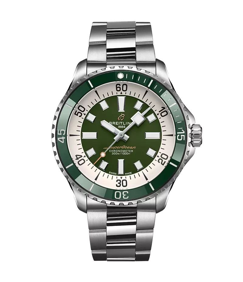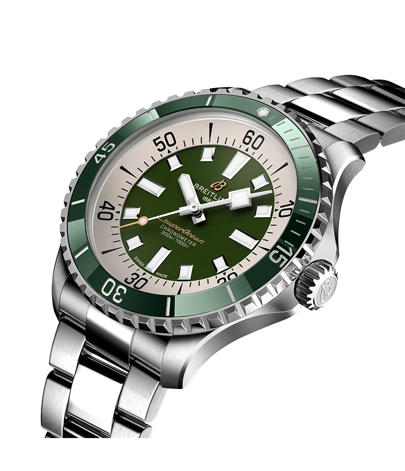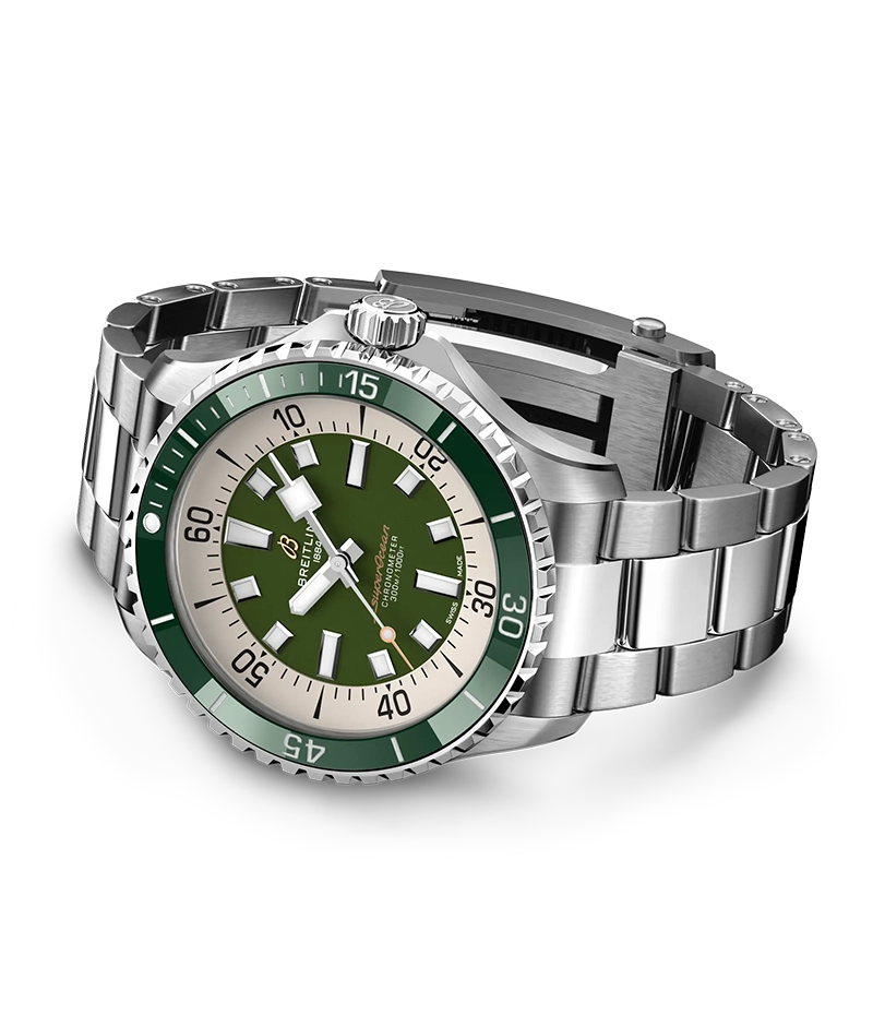 「スーパーオーシャン オートマチック 44」は、人気の高かったスローモーションのデザインコードを踏襲しながらも、セラミックインレイベゼルや鮮やかな色のダイヤルなど現代的な特徴を加味しています。また、幅広の針とインデックスには蓄光塗料スーパールミノバ®が塗布され、水中でも読み取りやすくなっています。