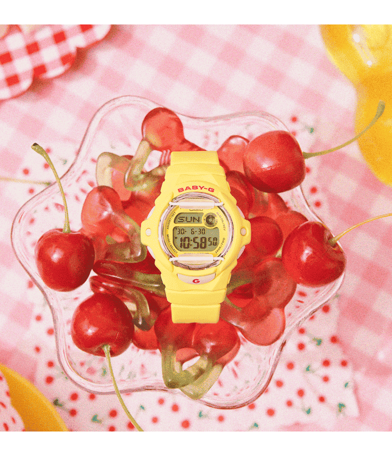 アクティブな女性に向けた耐衝撃・カジュアルウオッチBABY-Gから、ポップで元気なベースカラーにチェリーカラーのアクセントを効かせたモデルです。