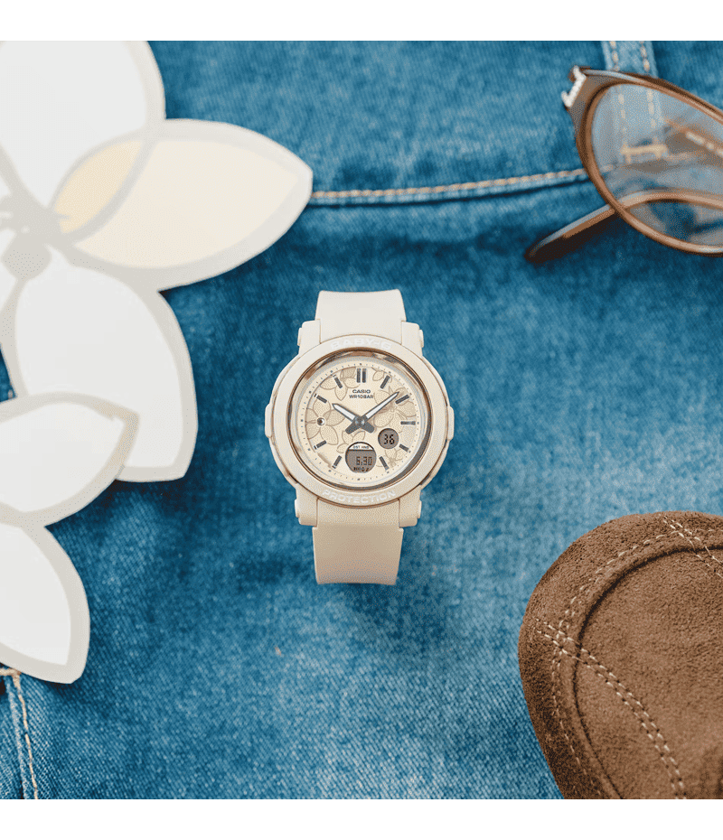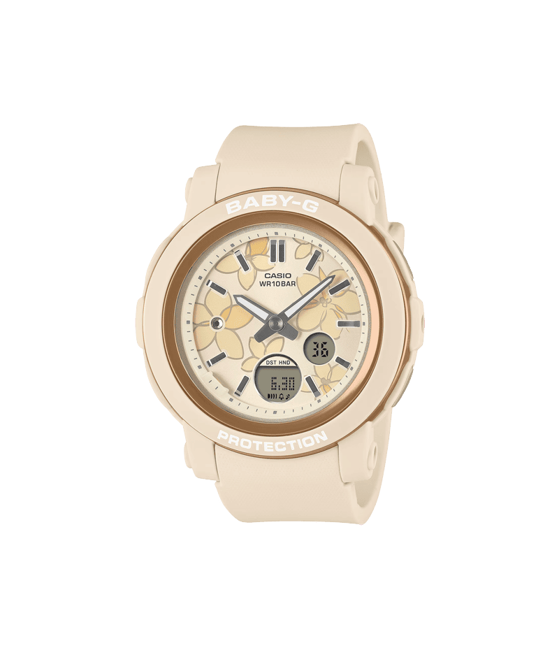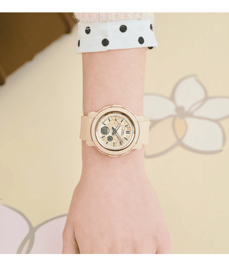 アクティブな女性に向けた耐衝撃・カジュアルウオッチBABY-Gから、フェイスに花柄をあしらったアナログウオッチです。
