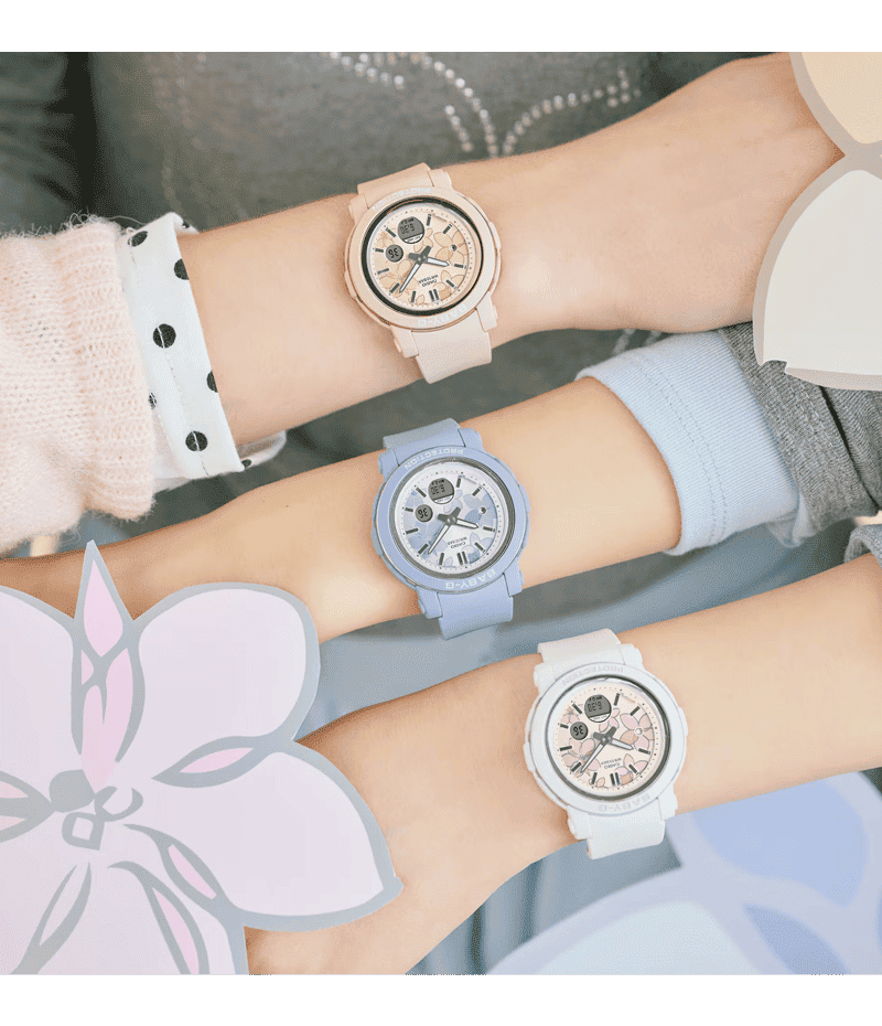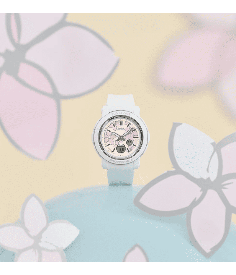 アクティブな女性に向けた耐衝撃・カジュアルウオッチBABY-Gから、フェイスに花柄をあしらったアナログウオッチです。