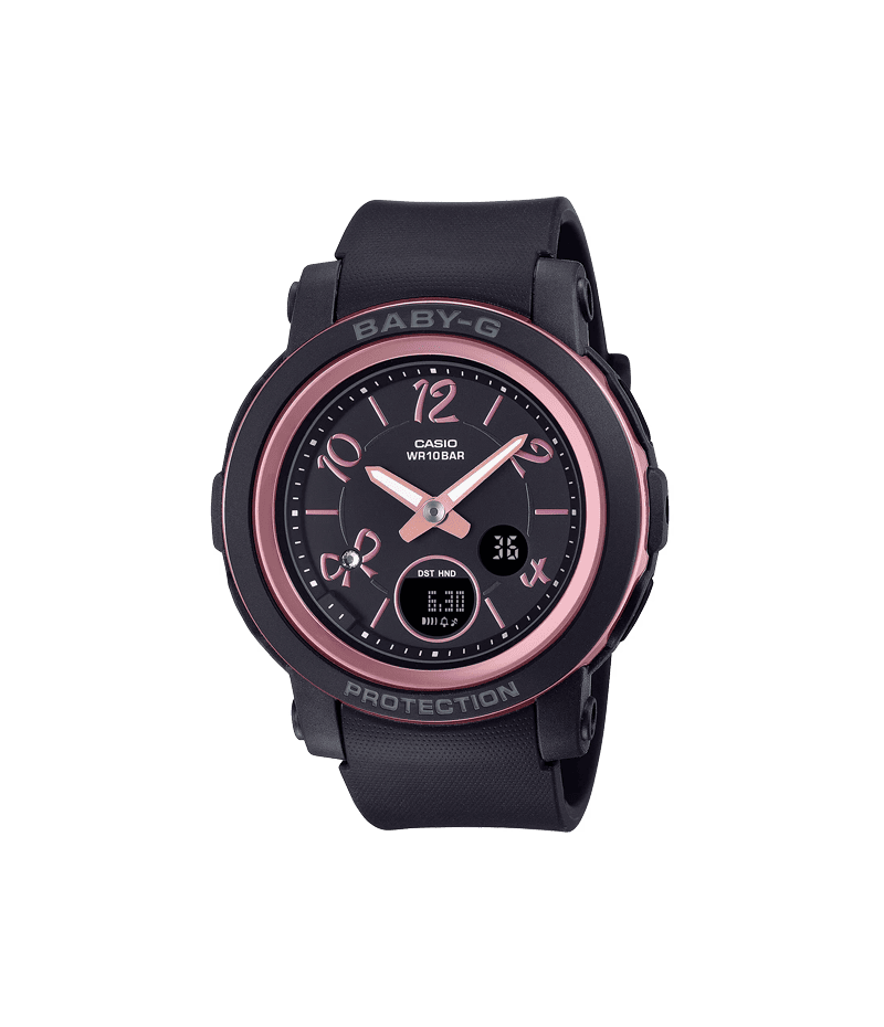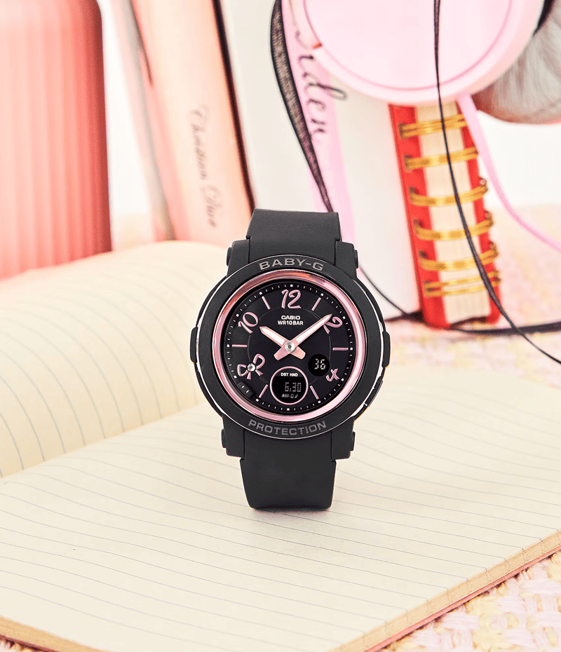 アクティブな女性のためのカジュアルウオッチBABY-Gから、フェミニンなリボンデザインを取り入れたモデルです。 ベースモデルはラウンドケースに視認性の良いワイドフェイスを組み合わせたBGA-290。 8時位置にリボンのモチーフを施し、中央にはキラキラと輝くクリスタルがアクセントとして配置されています。インデックスはリボンをイメージしたフォントでデザインし、時計全体に統一感と遊び心をプラスしました。 機能面では耐衝撃構造や着けたままで水泳もできる10気圧防水など頼れる機能を搭載しています。