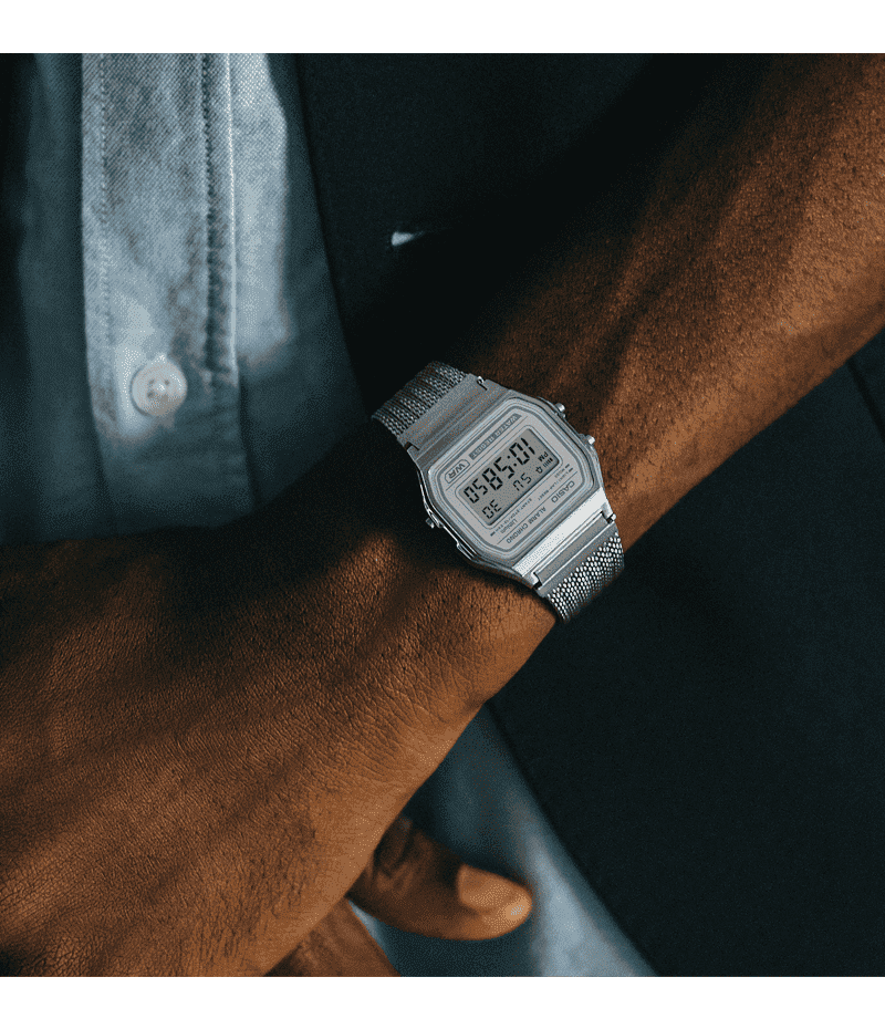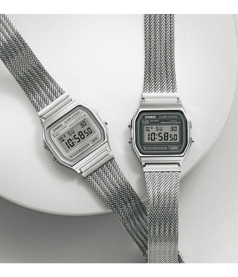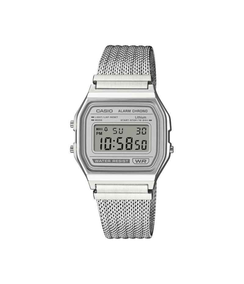 使い勝手の良さで根強い人気を誇るデジタルウオッチA158を、メッシュバンド仕様に仕立てたスタイリッシュなウオッチです。