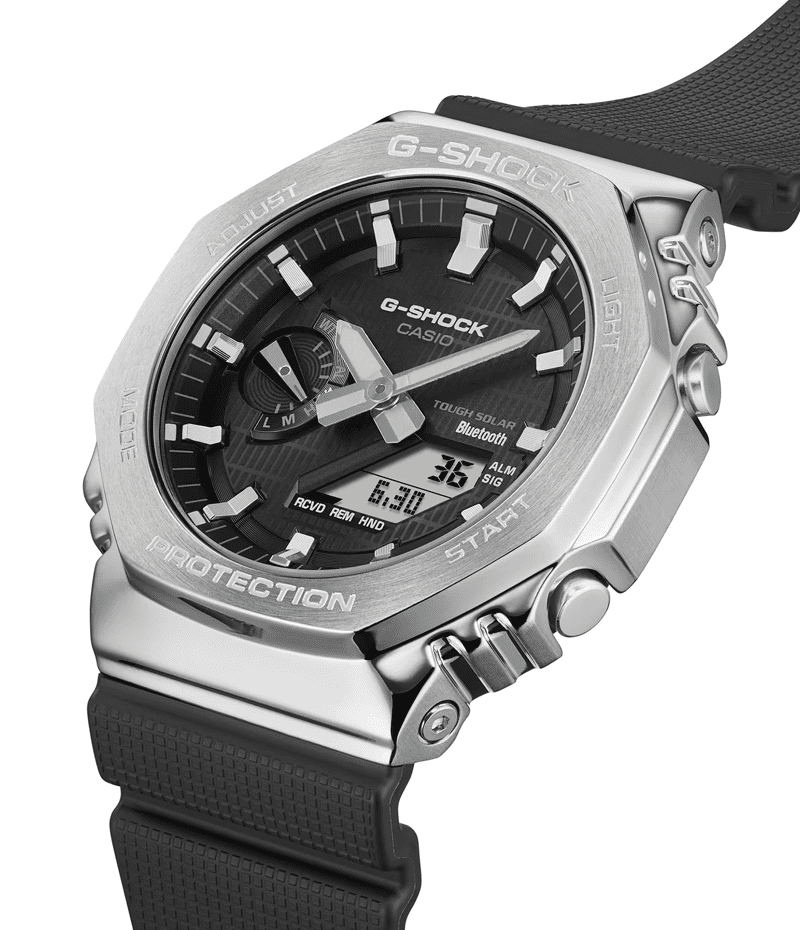 GM-2100の八角形フォルムはそのままに、スマートフォンリンクとタフソーラーを搭載したメタルベゼルのモデルです。