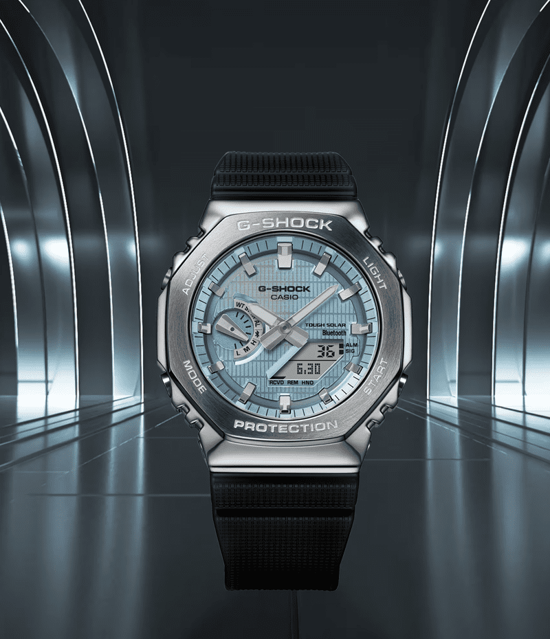 GM-2100の八角形フォルムはそのままに、スマートフォンリンクとタフソーラーを搭載したメタルベゼルのモデルです。バンドにはバイオマスブラスチックを採用し、環境にも配慮しました。