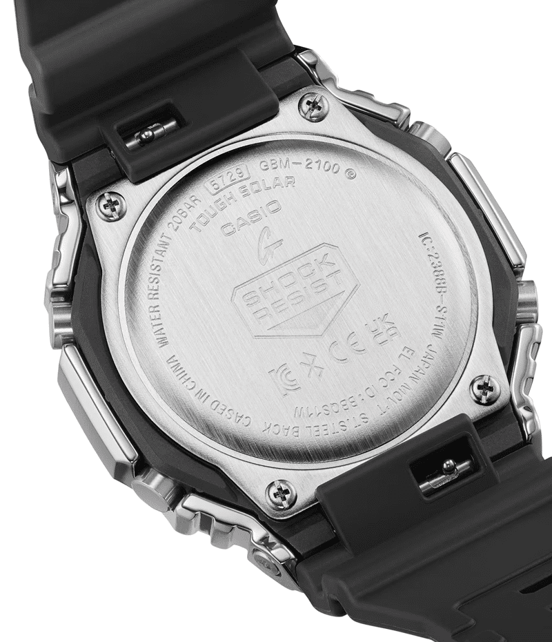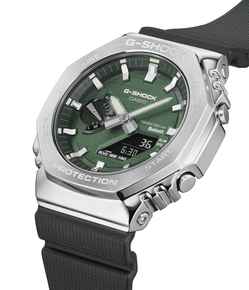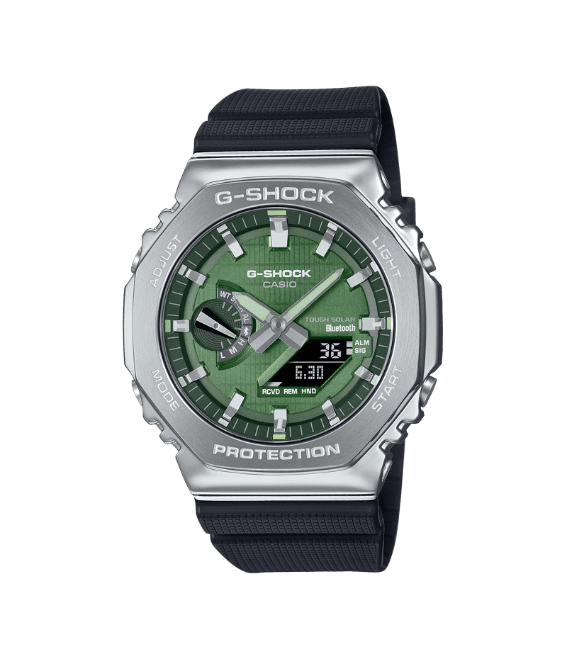 GM-2100の八角形フォルムはそのままに、スマートフォンリンクとタフソーラーを搭載したメタルベゼルのモデルです。