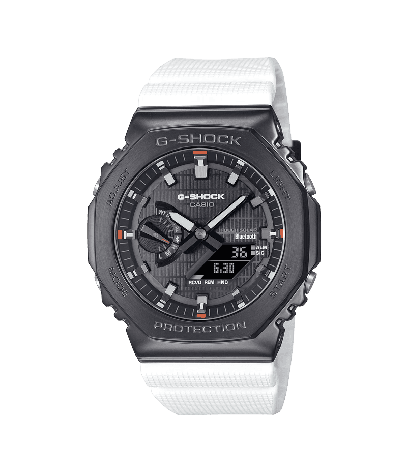 1983年の発売以来、飽くなき強さを求めて進化を続けるタフネスウオッチG-SHOCKから、2100シリーズの特徴であるスリムなサイズ感をキープしながら、スマートフォンリンクとタフソーラーを搭載したメタルベゼルのモデルです。