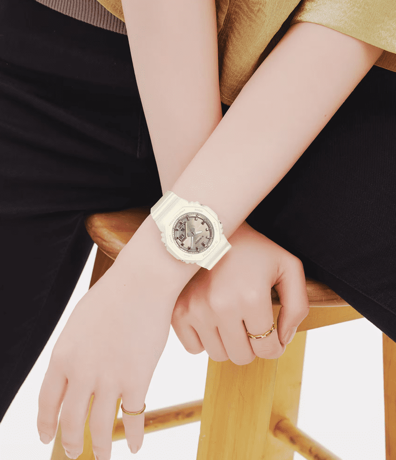 ベゼルとバンドにマット仕上げの偏光パール塗装を、文字板には美しい輝きを放つ艶消しのメタリックカラーをあしらい、ミニマルデザインのシンプルな表情に華やかさをプラスしました。