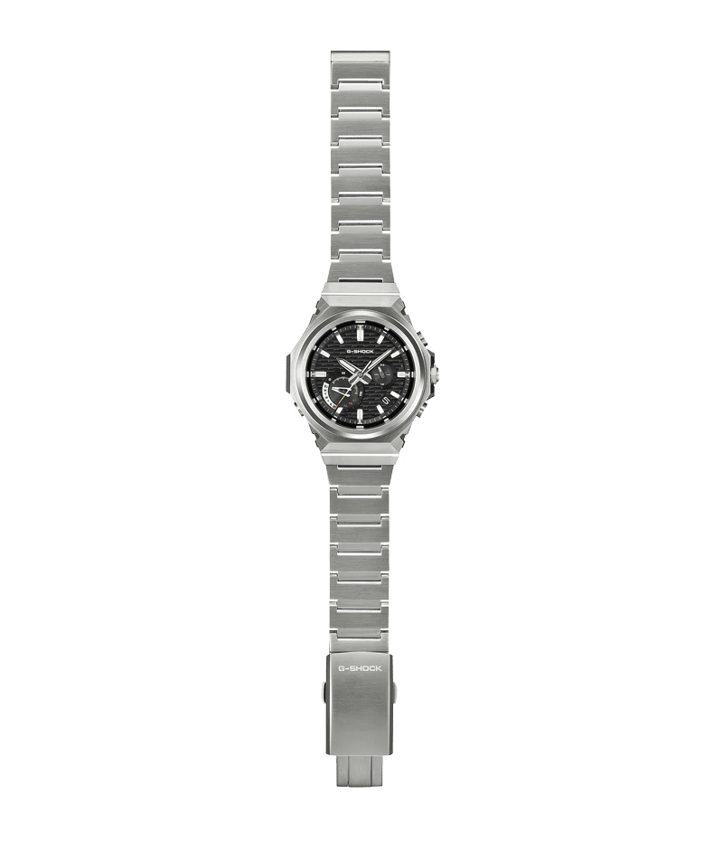ロゴを排したベゼルは光の角度で表情を変え豊かな質感を演出。ステンレススチール製のバンドにはヘアライン仕上げとミラー仕上げを施し、三つ折れ式中留は端正なデザインとホールドが魅力です。