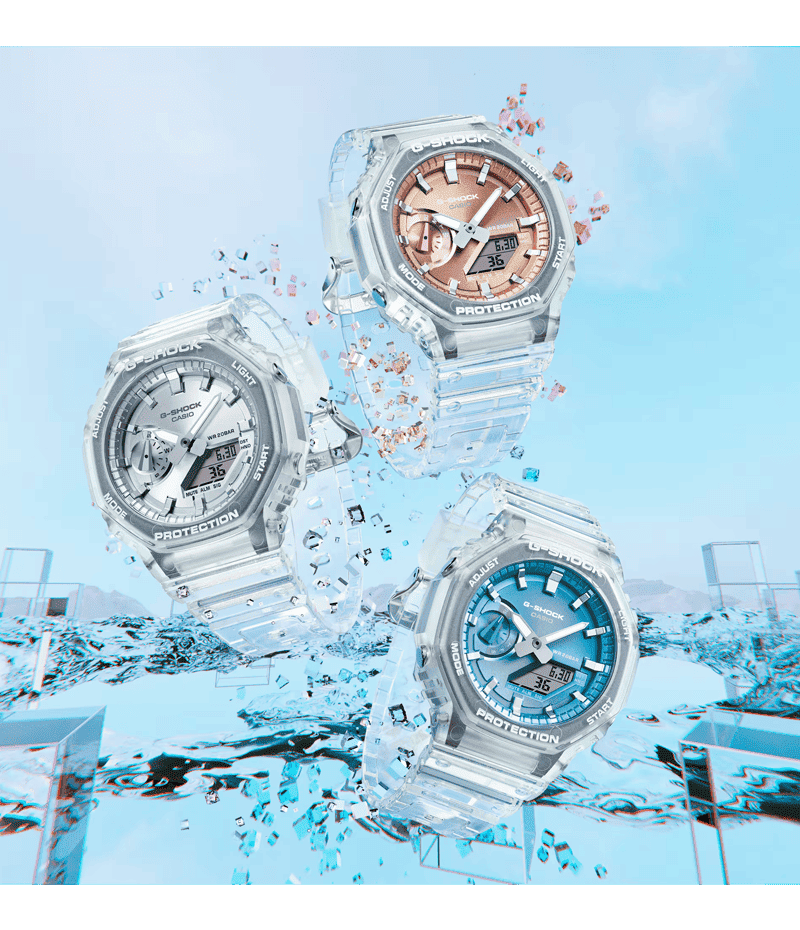 文字板に人気のカラーリングであるメタル蒸着塗装を施し、ベゼルとバンドはスケルトン素材にすることでサマーシーズンに向けた涼しげな印象に仕上げました。