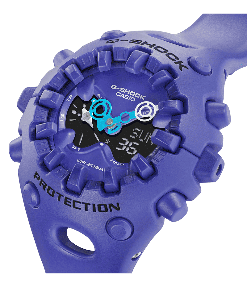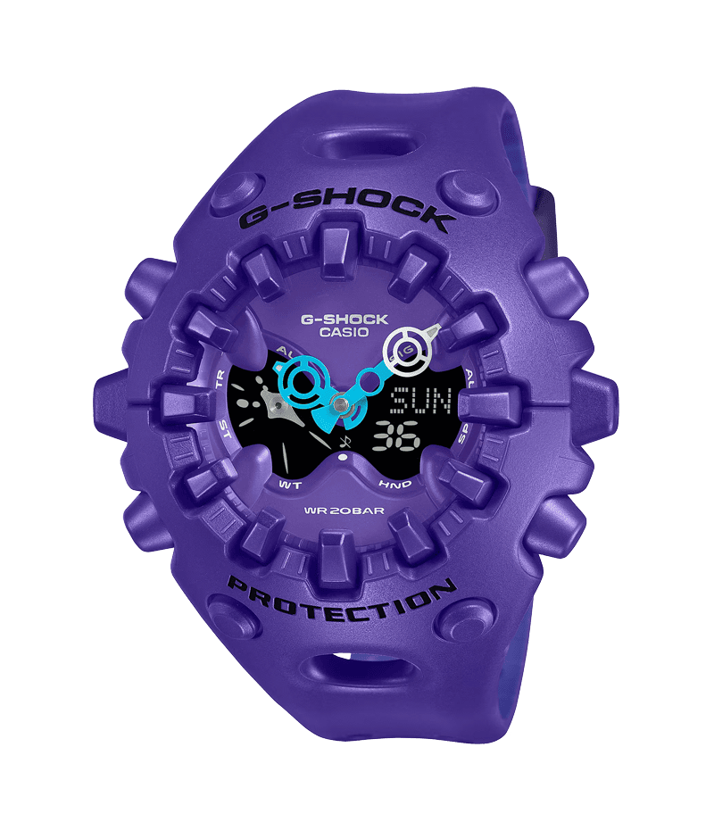 エッジの効いたパーツを組み合わせた有機的な外装フォルム、2つの穴が大きな特徴となっているショックリリース針など常識を覆す斬新な発想で、強さを求めて挑戦を続けるG-SHOCKのアイデンティティを形にしました。