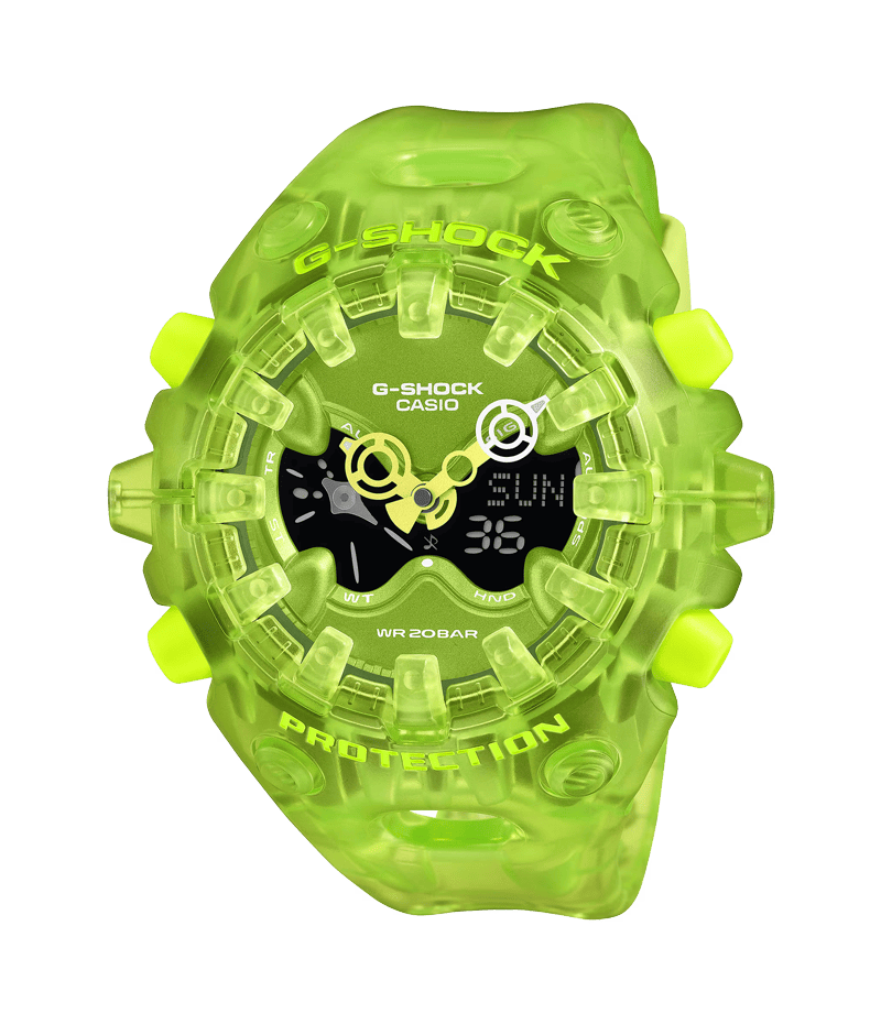 エッジの効いたパーツを組み合わせた有機的な外装フォルムや大型の全面液晶、ショックリリース針など斬新な発想でG-SHOCKのアイデンティティである「強さ」を形にしたGA-V01シリーズから、TRANSPARENT PACKのご紹介です。