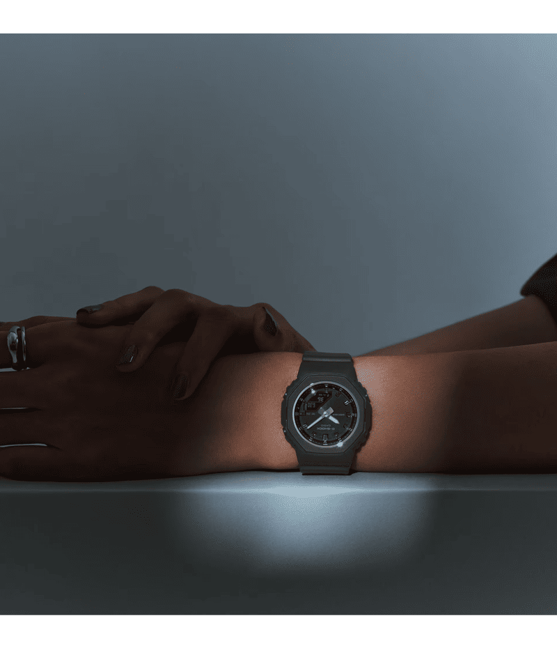 GMA-P2100シリーズと同等のサイズ・装着感でありながら、メタリックパーツのさりげない輝きが高級感や洗練さを演出しています。 また、ベゼル周りの文字要素を省き、インデックスはGMA-P2100シリーズよりもシャープなデザインに変更することでより洗練された印象を与えます。
