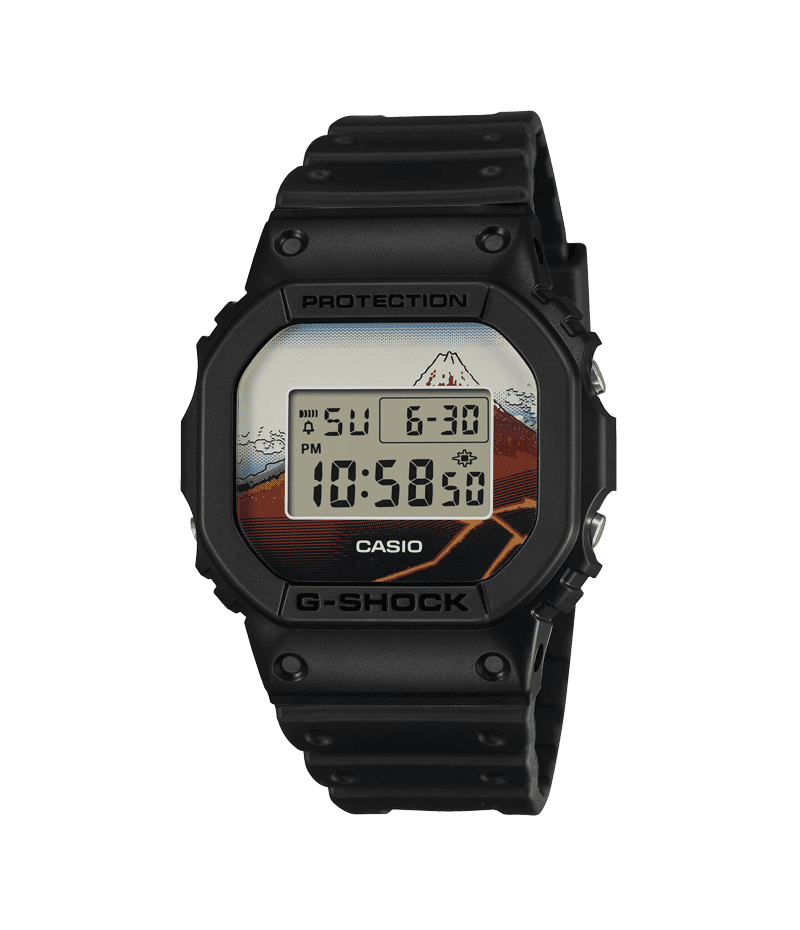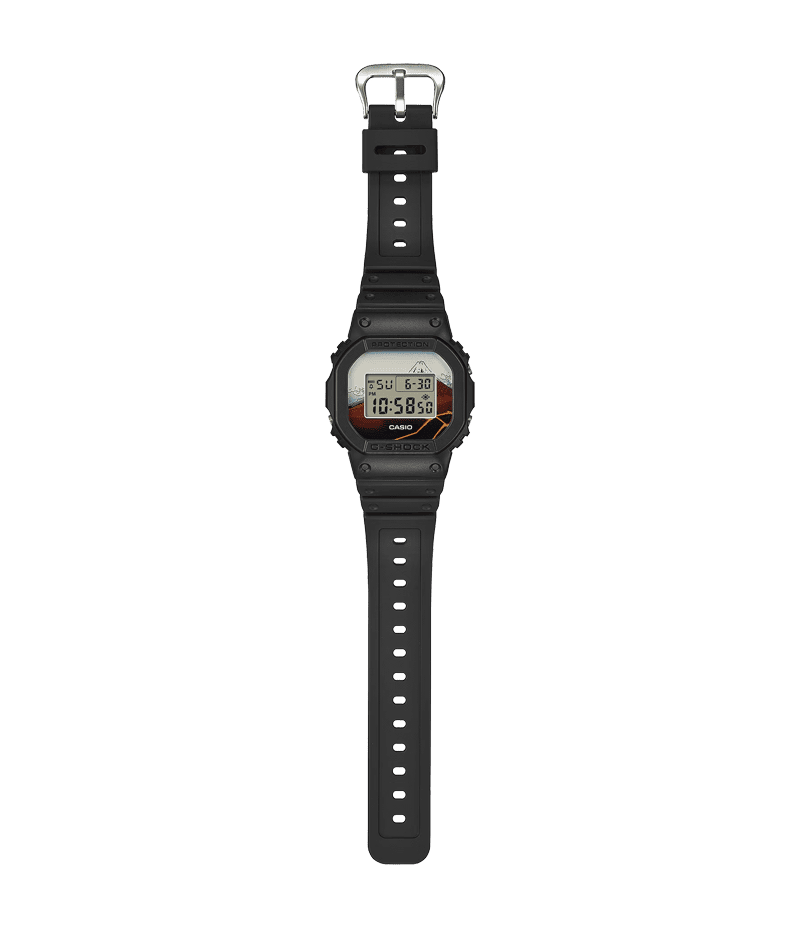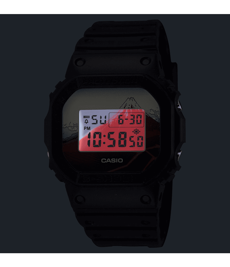 北斎の代表作である富嶽三十六景の中から「山下白雨」を採用しました。 ベースモデルにはアイコニックな定番デジタルDW-5600を採用し、文字板には「山下白雨」を大胆にデザイン。LEDバックライト点灯時には文字板と一体となって同作品の雄大さを表現します。裏蓋には漢字で“日本”という文字を刻印しました。