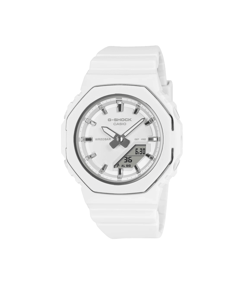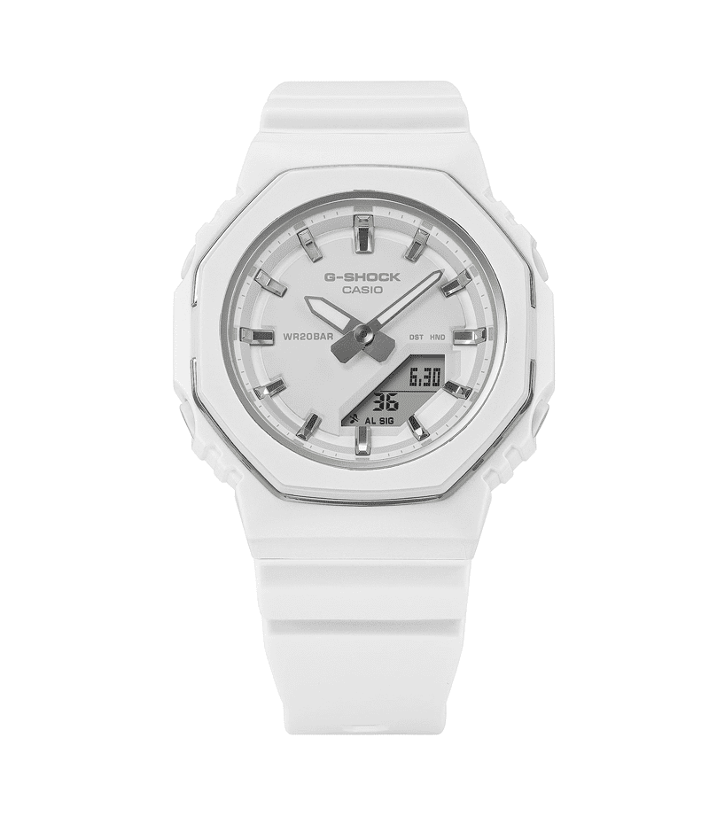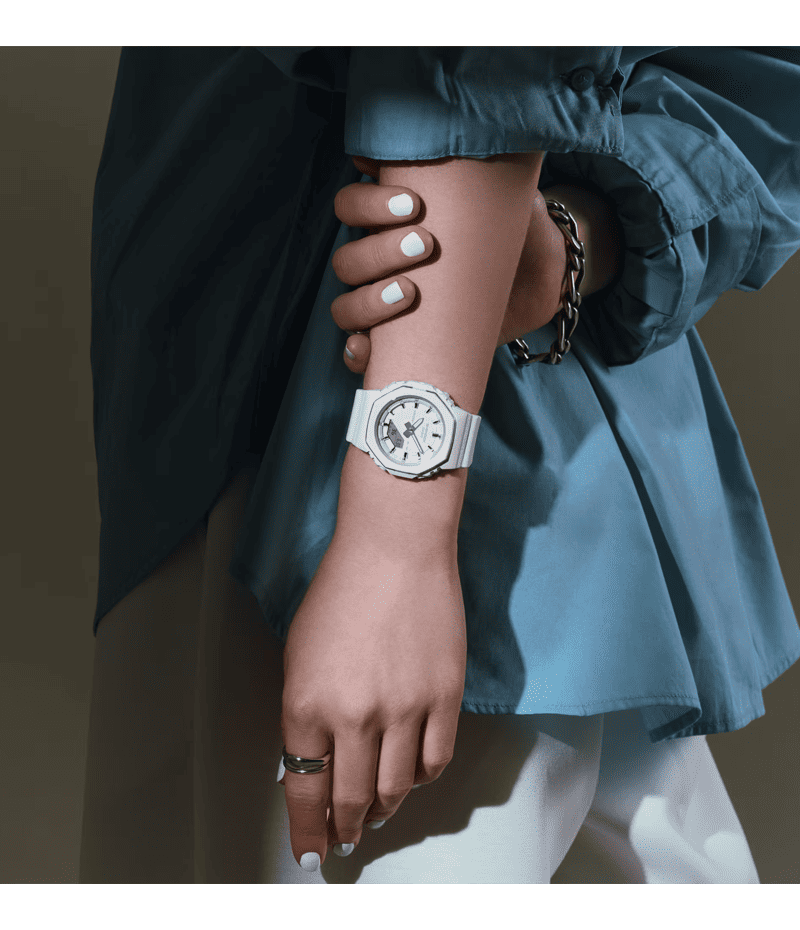 GMA-P2100シリーズと同等のサイズ・装着感でありながら、メタリックパーツのさりげない輝きが高級感や洗練さを演出しています。 また、ベゼル周りの文字要素を省き、インデックスはGMA-P2100シリーズよりもシャープなデザインに変更することでより洗練された印象を与えます。