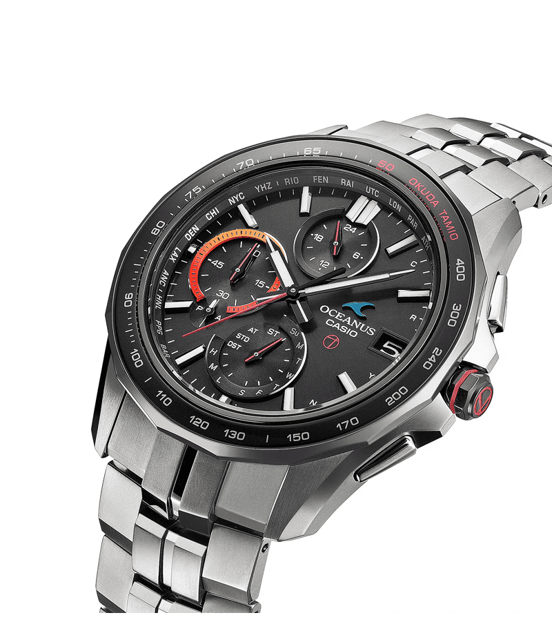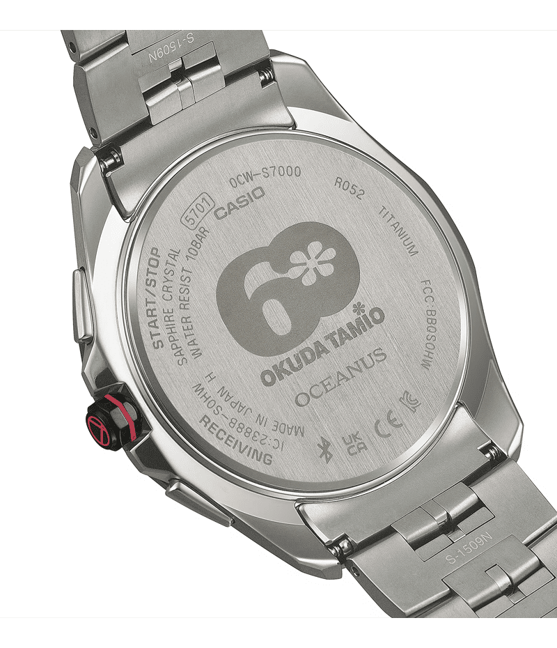 妥協なきモノ創りとMade in Japan にこだわるOCEANUSと、音楽へのこだわりと自分らしさを貫き、今なおミュージックシーンの最前線を走り続ける奥田氏の全面監修で仕上げた数量限定モデルです。 サファイアガラスベゼルのタキメーターには「OKUDA TAMIO」の文字と生誕60周年を祝い「60」の文字を赤色にした特別仕様。