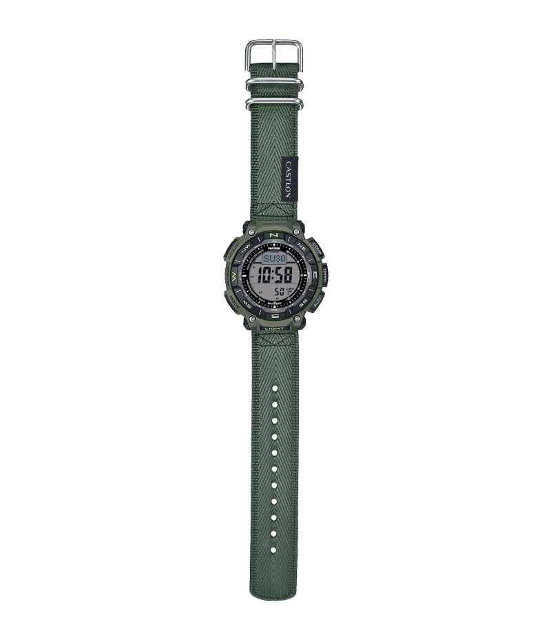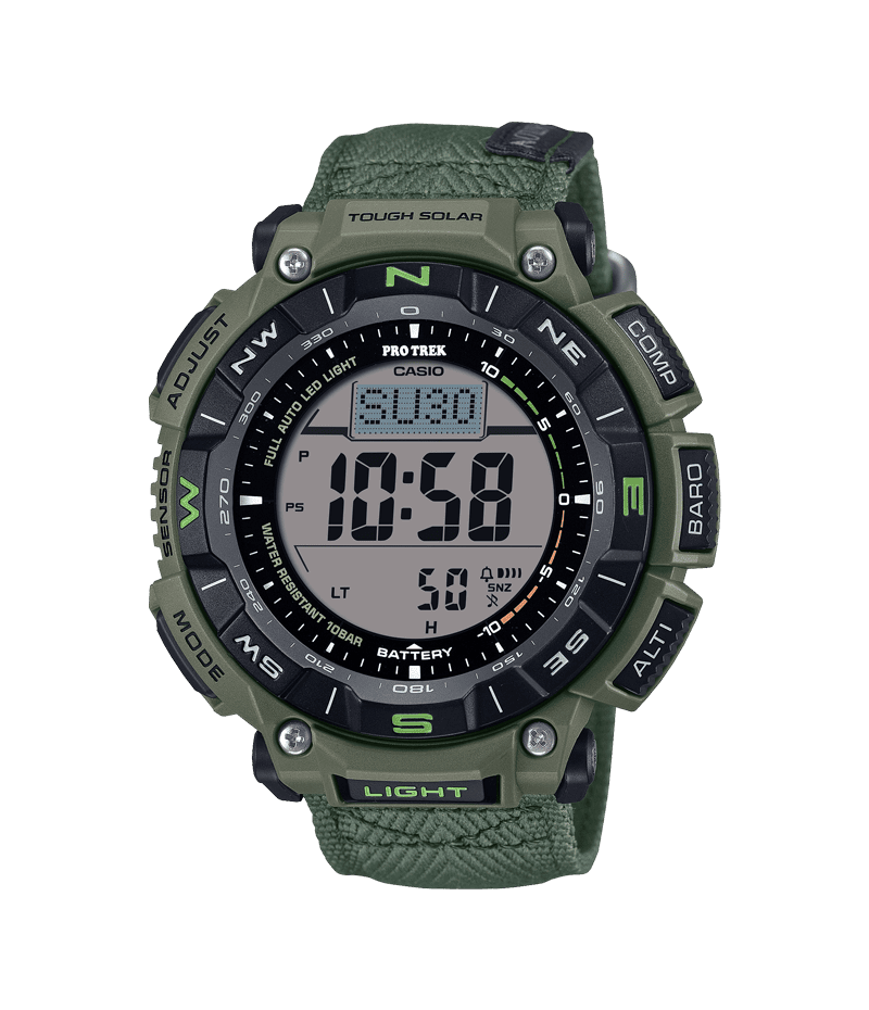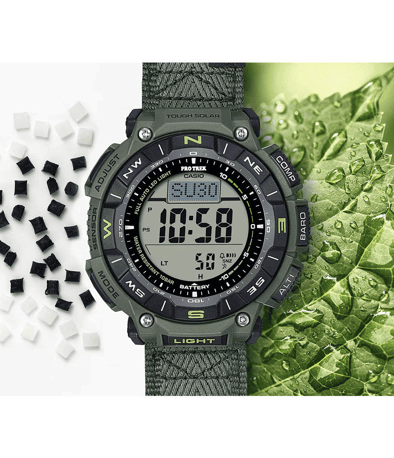 自然を愛する人に向けた本格アウトドアギアPRO TREKより、環境負荷低減への貢献が期待される素材を採用したソーラー搭載モデル「PRG-340」です。