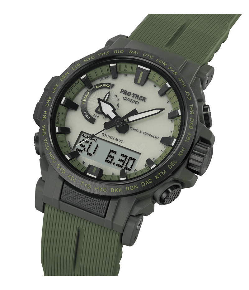 自然を愛する人の本格アウトドアギアPRO TREKから、全面蓄光ソーラー文字板を採用した「PRW-61LD」です。