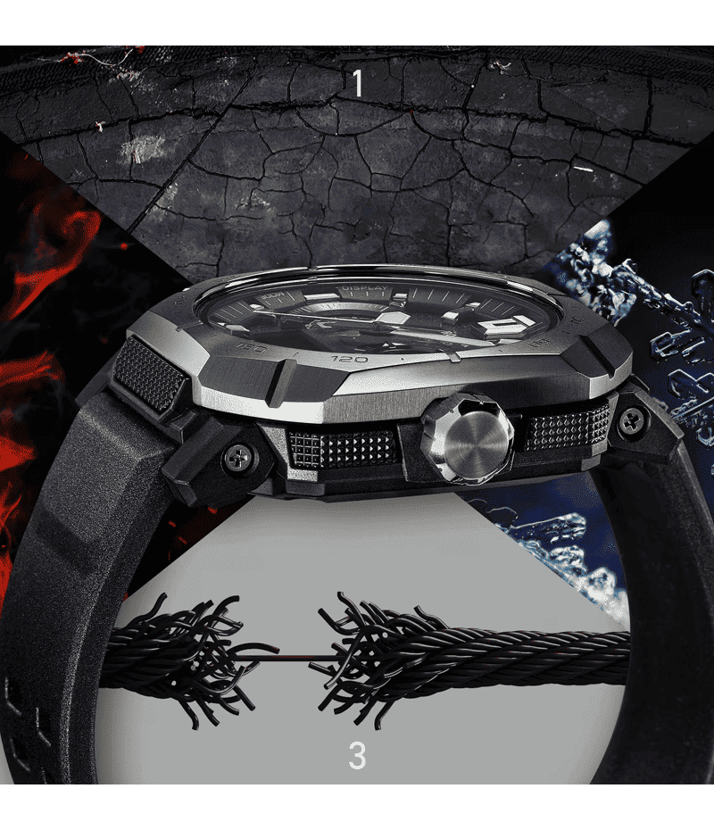 アウトドアの聖地「ヨセミテ」のエル・キャピタンをイメージした角型ベゼルと、かつてのロッククライマーが使用したピトンをモチーフにした9時位置の小針が自然への敬意と冒険心を表現しています。