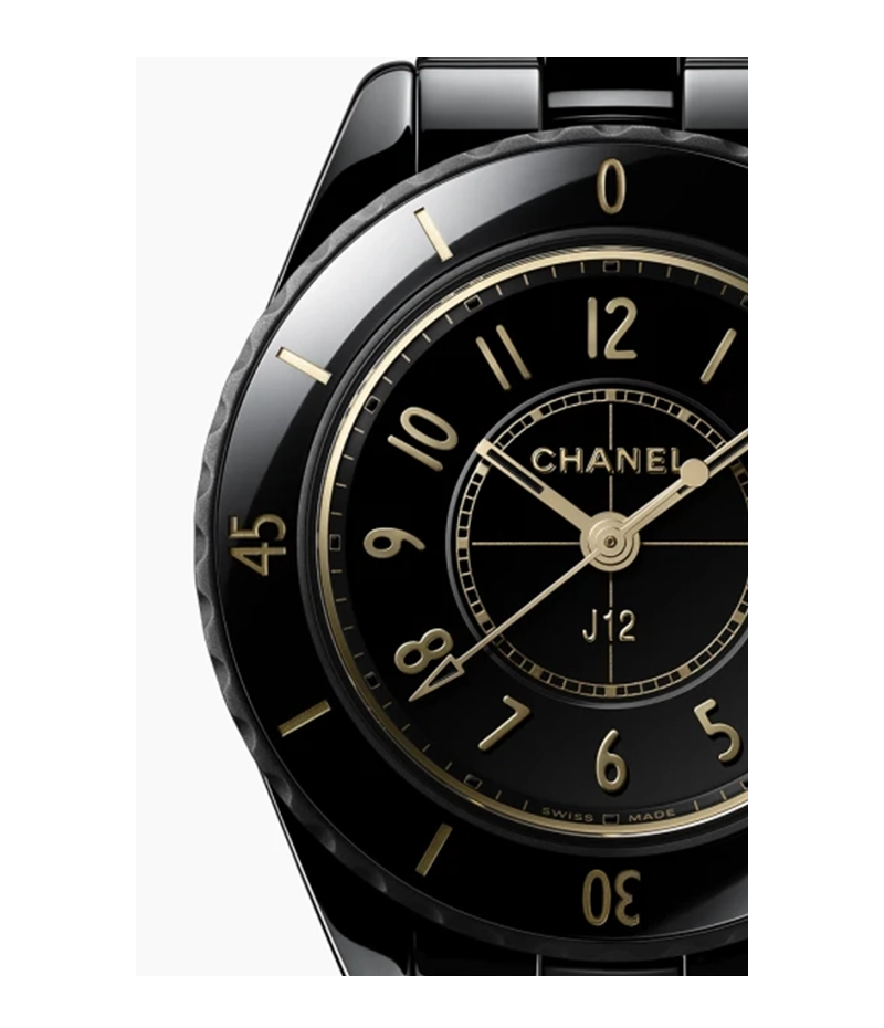 洗練されたデザインは、ベゼルやダイヤルに施されたブラックとゴールドのアクセントによる繊細な調和を際立たせており、ガブリエルシャネルがこの色に抱いた情熱へのオマージュとなっています