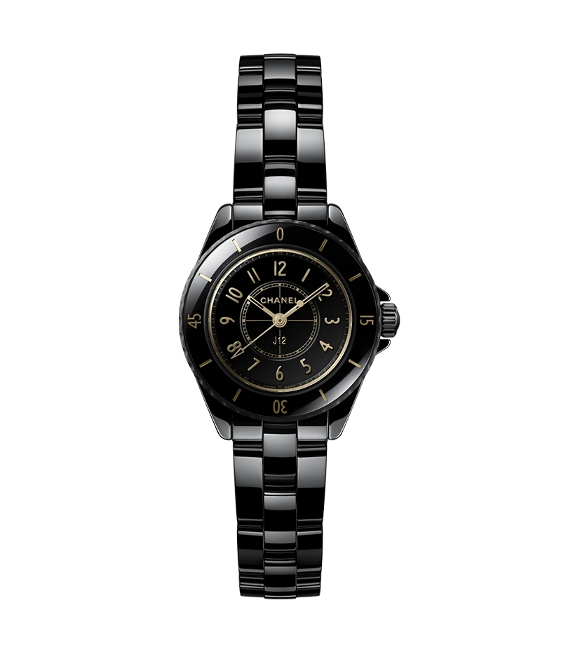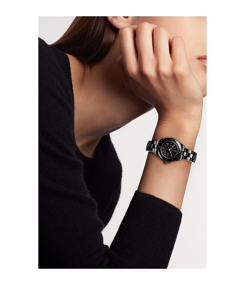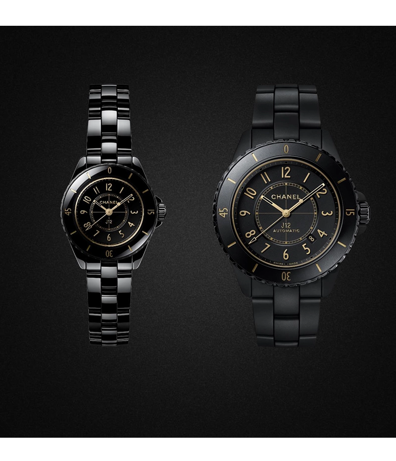 これらのモデルは、ブラックの高耐性セラミックとブラックコーティングのスチールを組み合わせて製作されており、J12のアイコニックなデザインを新しい表現で体現しています。それぞれがコントラストを楽しむ仕上がりになっており、28mmはポリッシュで仕上げられています。
