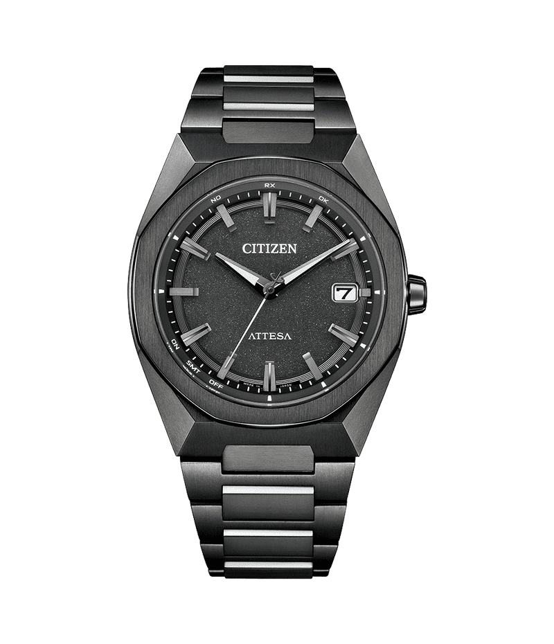 力強い個性を演出する八角形のベゼルの頂点と、アテッサらしい直線的な稜線を合わせた美しいケースのフォルムが特徴的です。文字板は、ザラっとした質感でチタニウムの原石をイメージ。立体感を演出する上板とインデックスに、メタリックな見返しリングを組み合わせた3体構造で、シンプルな中にもソリッドな印象と力強さを感じさせる仕上がりです。